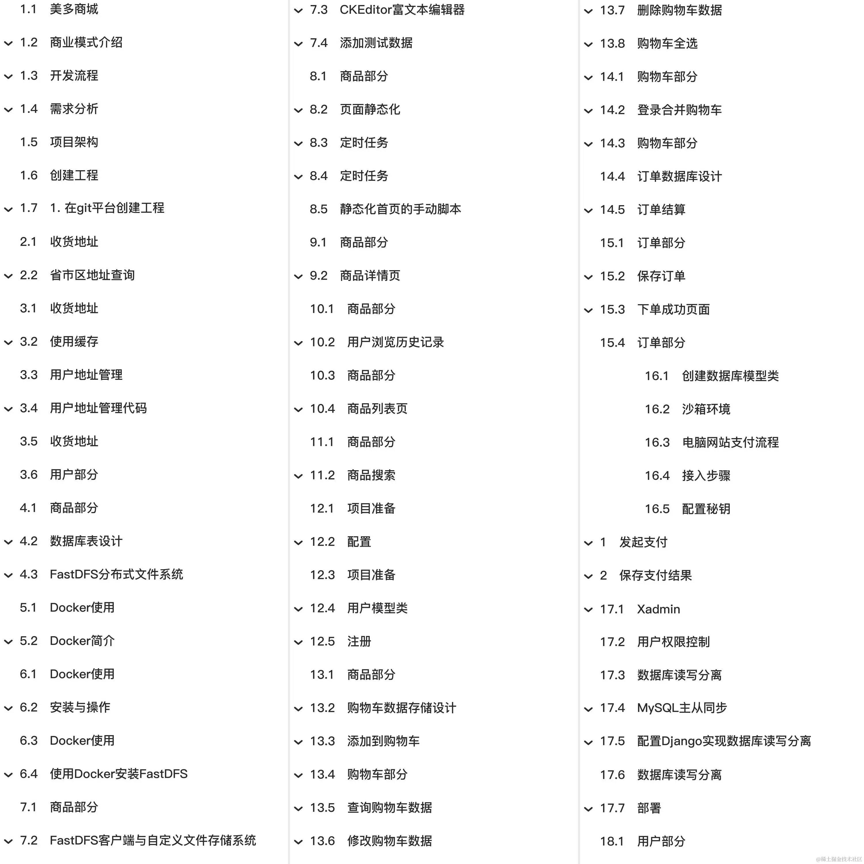 教程总体简介:美多商城 商业模式介绍 1.B2B--企业对企业 2.C2C--个人对个人 5.O2O--线上到线下 开发流程 说明: 需求分析 1. 用户部分 注册 登录 个人信息 地址管理 修改密码 3. 购物车部分 购物车管理 项目架构 创建工程 1. 在git平台创建工程 2. 添加前端文件 合并 3. 创建Django REST framework工程 4. 修改manage.py 5. 创建数据库 收货地址 省市区地址查询 数据库建表 后端接口设计 前端 使用缓存 安装 使用方法 为省市区视图添加缓存 缓存数据保存位置与有效期的设置 用户地址管理代码 后端 商品部分 数据库表设计 表结构 数据库模型类 FastDFS分布式文件系统 1. 什么是FastDFS 2. 文件上传流程 Docker使用 安装与操作 1. 在Ubuntu中安装Docker 2. 启动与停止 3. Docker镜像操作 5. 将容器保存为镜像 6. 镜像备份与迁移 使用Docker安装FastDFS 1. 获取镜像 2. 运行tracker 3. 运行storage CKEditor富文本编辑器 1. 安装 3. 添加CKEditor设置 5. 为模型类添加字段 6. 修改Bug 添加测试数据 在admin中注册模型类 添加FastDFS保存的测试图片数据 添加对应的数据库测试数据 页面静态化 注意 定时任务 添加应用 设置任务的定时时间 静态化首页的手动脚本 商品详情页 异步任务的触发 脚本工具 用户浏览历史记录 2. 查看 商品搜索 2. 搜索引擎原理 3. Elasticsearch 4. 使用Docker安装Elasticsearch及其扩展 6. 前端 项目准备 配置 1. 修改settings/dev.py 文件中的路径信息 2. INSTALLED_APPS 4. Redis 5. 本地化语言与时区 7. 异常处理 用户模型类 Django用户模型类 创建自定义的用户模型类 购物车数据存储设计 1. Redis保存已登录用户 添加到购物车 2. 后端实现 查询购物车数据 登录合并购物车 修改登录视图 订单结算 订单部分 保存订单 4. 使用乐观锁改写下单逻辑 5. 需要修改MySQL的事务隔离级别 下单成功页面 前端文件 沙箱环境 电脑网站支付流程 接入步骤 配置秘钥 发起支付 保存支付结果 Xadmin 用户权限控制 数据库读写分离 MySQL主从同步 1. 主从同步的定义 3. 配置主从同步的基本步骤 4. 详细配置主从同步的方法 配置Django实现数据库读写分离 2. 创建数据库操作的路由分发类 部署 1. 静态文件 2. 动态接口 图片验证码 3. 设置域名 4. 前端Vue代码: 跨域CORS 使用Celery完成发送短信 判断帐号是否存在 1. 判断用户名是否存在 JWT 什么是JWT 起源 传统的session认证 基于token的鉴权机制 JWT长什么样? JWT的构成 header playload signature 如何应用 urllib使用说明 绑定用户身份接口 用户中心个人信息 邮件与验证 使用Django发送邮件 保存邮箱并发送验证邮件 验证邮箱链接
