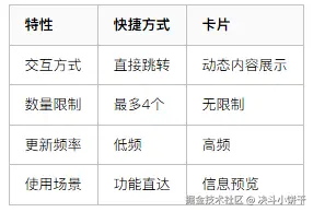 - 四要素模型:每个快捷方式必须包含shortcutId、label、icon、wants四大要素