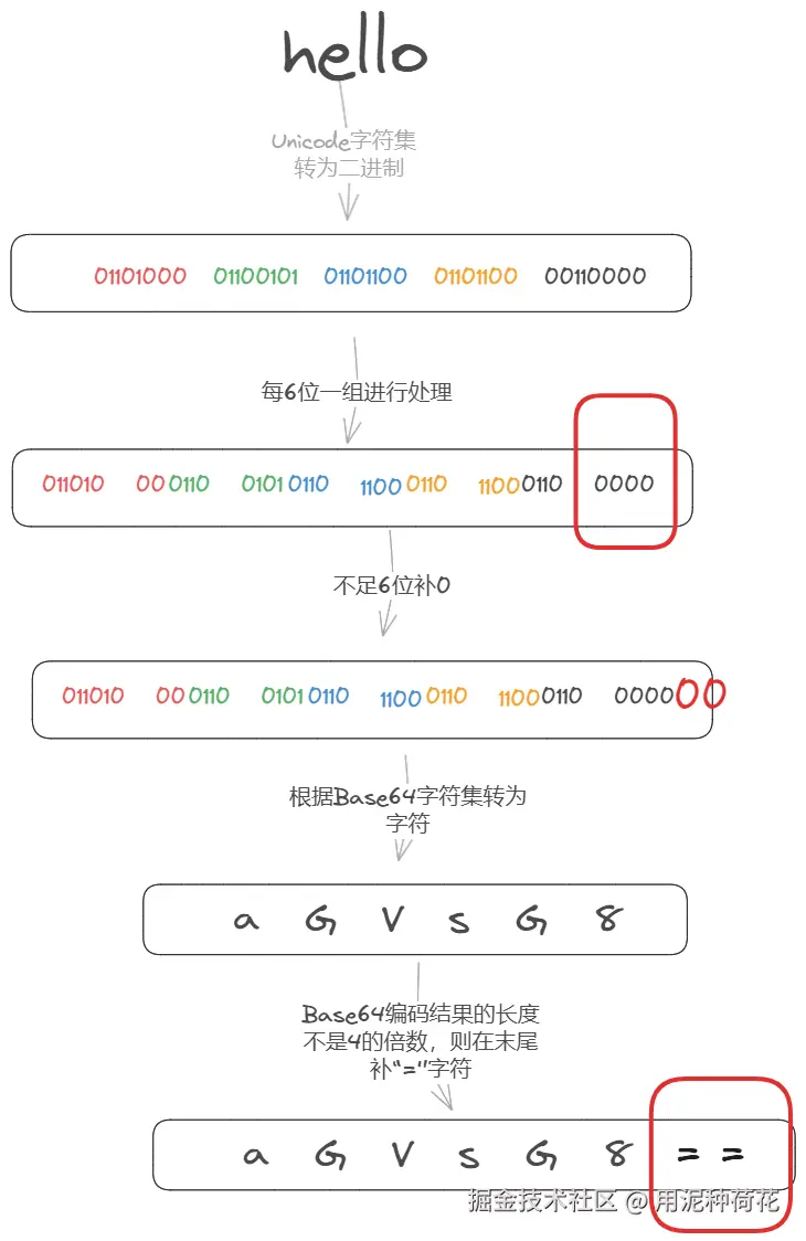 Base64编码的每个字符需要 6位 二进制数据。如果在编码过程中,二进制数据的长度不是 6 的倍数,会在二进制数据末尾添加 0 以补足至 6 的倍数。- 示例: A 二进制数据是 01000001,长度是 8,不是 6 的倍数,会在末尾添加 0,变成 010000010000,使其长度成为 6 的倍数。