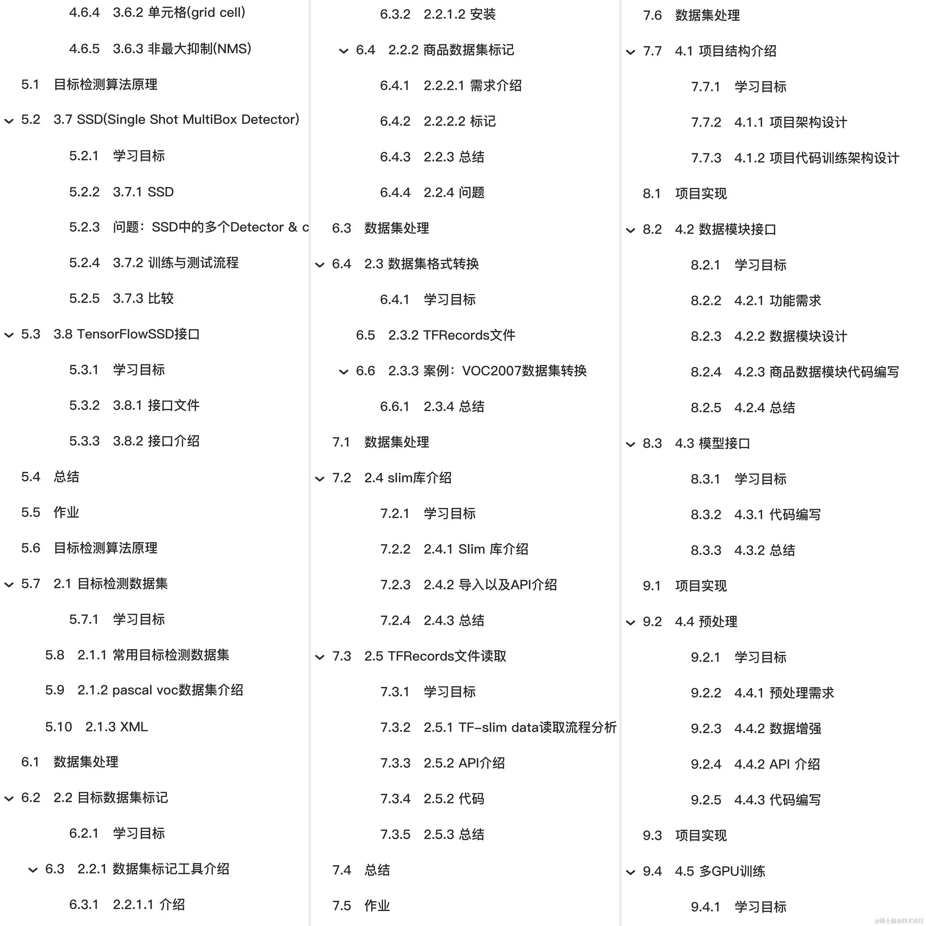 教程总体简介:要求 目标 1.1 项目演示 学习目标 1.1 图像识别背景 1.2 什么是目标检测 1.2.1 目标检测定义 1.2.1.1 物体 1.3 目标检测应用场景 1.3.1 行业 1.3.2 应用类别 1.4 开发环境搭建 目标检测概述 3.1 目标检测任务描述 3.1.4 目标定位的简单实现 项目实现 4.9 Web Server + TensorFlow Serving Client 4.9.1 环境安装 4.9.1 Web Server 4.10 服务器部署+小程序 4.10.2 小程序 目标检测算法原理 3.2 R-CNN 3.2.1 目标检测-Overfeat模型 3.2.7 问题? 3.3 SPPNet 3.5 Faster R-CNN 3.5.2 RPN原理 3.5.4 效果对比 3.6 YOLO(You only look once) 3.6.1 YOLO 这些候选框与我们前面R-CNN系列算法中有哪些不同? 3.6.2 单元格(grid cell) 3.6.3 非最大抑制(NMS) 3.6.4 训练 3.7 SSD(Single Shot MultiBox Detector) 3.7.1 SSD 问题:SSD中的多个Detector & classifier有什么作用? 3.7.2 训练与测试流程 3.8 TensorFlowSSD接口 3.8.1 接口文件 数据集处理 2.2 目标数据集标记 2.3 数据集格式转换 2.3.2 TFRecords文件 2.3.3 案例:VOC2007数据集转换 2.4 slim库介绍 2.4.2 导入以及API介绍 4.1 项目结构介绍 4.1.2 项目代码训练架构设计 4.2 数据模块接口 4.2.1 功能需求 4.2.3 商品数据模块代码编写 4.4 预处理 4.4.2 数据增强 4.5 多GPU训练 4.5.1 训练步骤以及设备部署需求 4.5.2 运行过程与代码编写 主函数训练逻辑 一、选择设备初始配置初始部署设备信息 Create global_step. 选择全局步长变量所在的设备 获取类 获取网络参数 初始化网络 获取形状 获取default anchors 默认只返回一个样本 进行数据的批处理以及获取到队列当中(获取多个数据) 要获取批处理:[image, gclasses, glocalisations, gscores] 单列表? Tensor 列表 重叠的列表进行转换成单列表 r包含着多个样本 计算所有GPU / CPU设备的平均损失和每个变量的梯度总和 获取训练的OP以及摘要OP pre-trained模型路径. 开始训练 4.6 测试