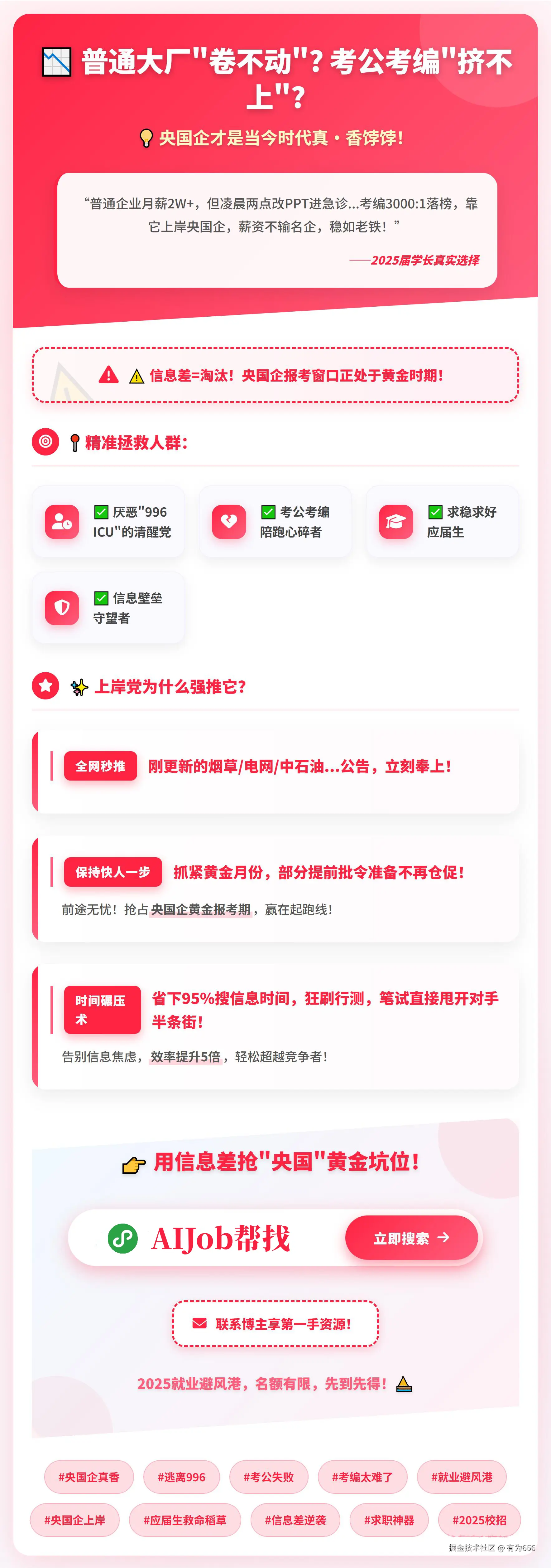 总结:新人期在国企度过最安稳,不仅能学知识、受培养,养习惯,还能获得机制的保护!如果你也想上岸央国企,建议一定要找对渠道,毕竟僧多粥少,大家都想进。在这里,强推下面的这个AIJob帮找,直接帮你打破信息差,获取一手上岸干货!博客专栏里面也写过一篇,能帮助大家掌握招聘动向:从选岗-网申-笔试-面试-offer,全流程介绍,赶紧马住!还有央国企求职大礼包,都是免费的,非常有用!