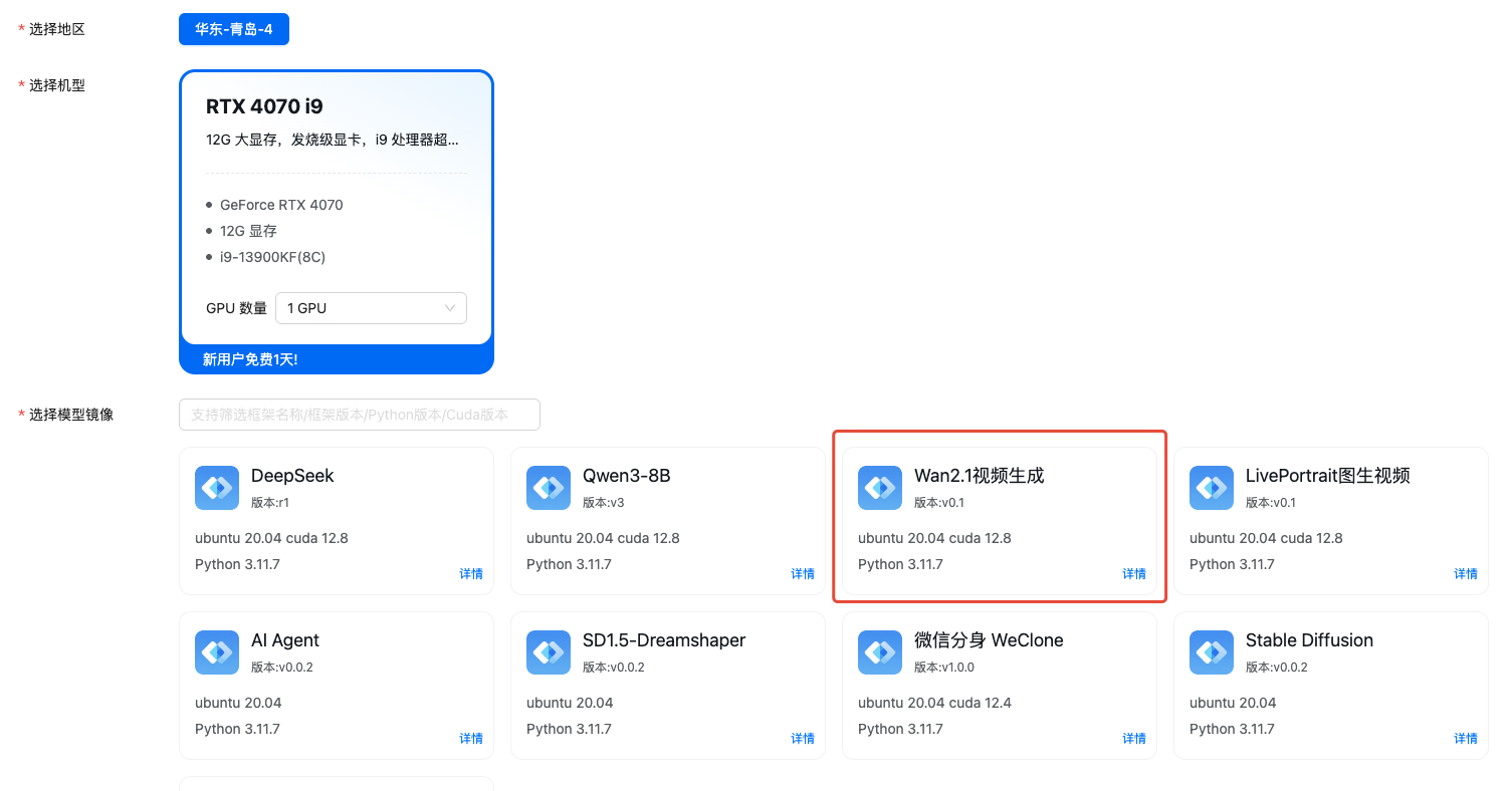 2、选择 Wan2.1视频生成“”镜像,创建实例