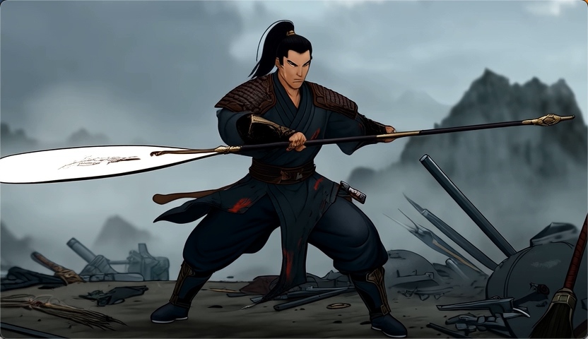 python generate.py --task t2v-1.3B --size 832*480 --ckpt_dir ./Wan2.1-T2V-1.3B --offload_model True --t5_cpu --sample_shift 8 --sample_guide_scale 6 --prompt "A lone martial warrior with flowing black hair tied in a topknot, intense eyes, and a stern, determined expression performs a sweeping dragon-like spear technique mid-air. He wears a torn dark battle robe fluttering in the wind, streaked with dirt and blood, reinforced with armored shoulder plates and leather bindings. His long spear is in motion, forming a blazing circular trail that arcs like a coiled dragon. The background is a mist-covered mountain battlefield, scattered with broken weapons and shadowy fallen soldiers. Wind and dust swirl violently as his movement sends shockwaves through the air. His pose is dynamic — mid-leap with one leg raised, spear spinning overhead with unstoppable energy. Dramatic ink-style lines radiate from the motion, with exaggerated shadows and highlights enhancing the graphic martial arts comic style. Intense expression, raw power, fluid motion.