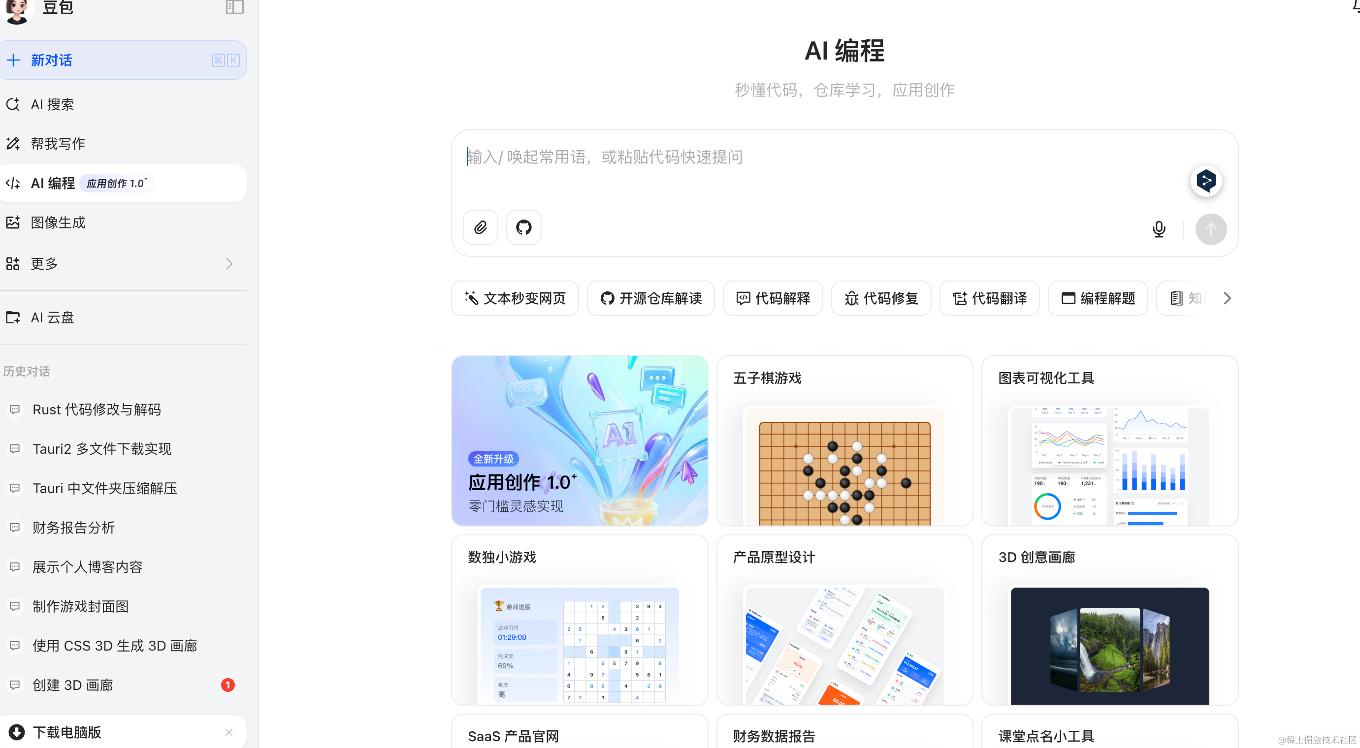 豆包现在集成了AI编程的菜单,直接就可以写前端页面了,太厉害了