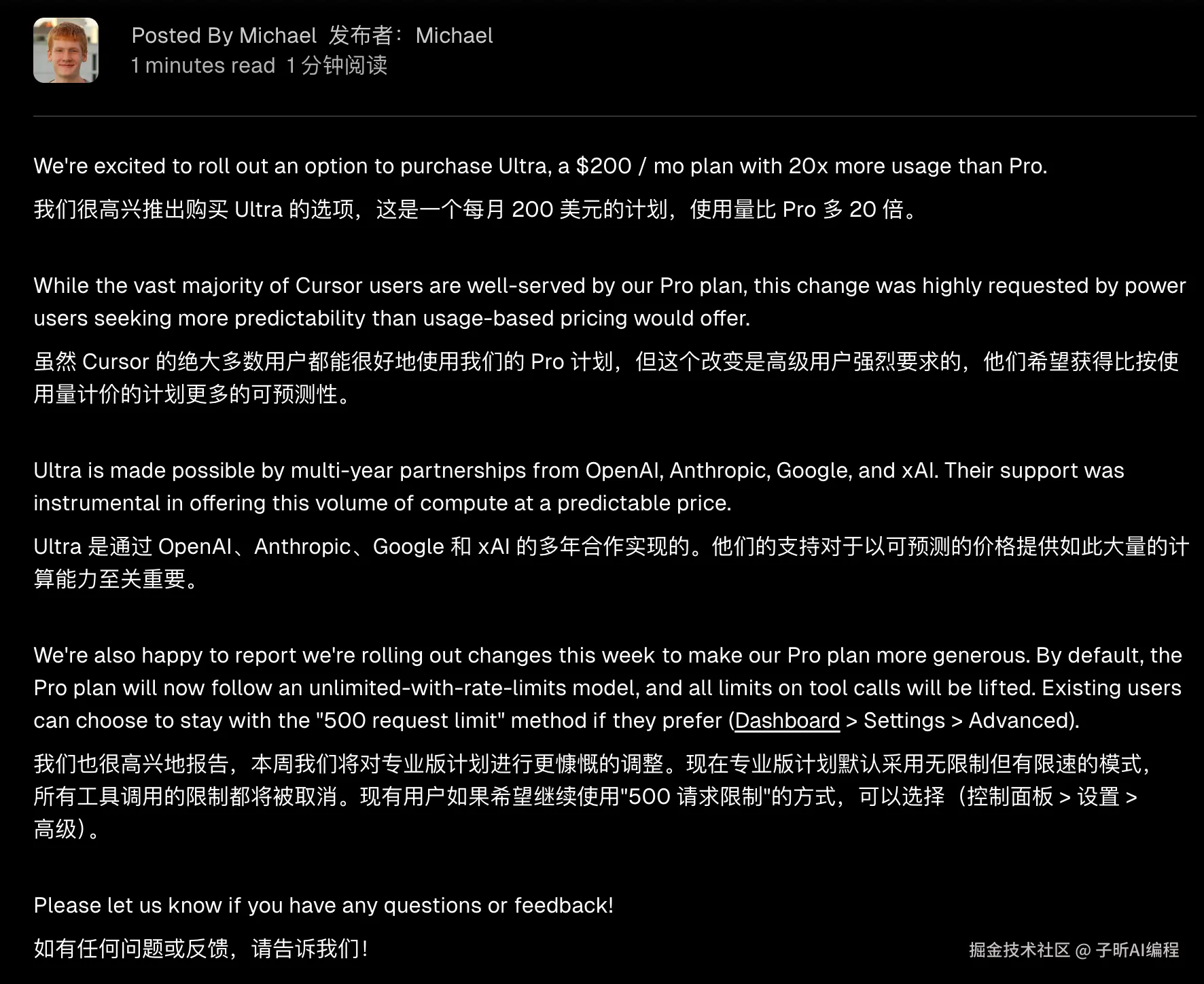 说实话,Cursor推出Ultra版这个操作,我觉得商业逻辑是对的,但执行上确实有问题。