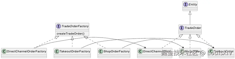 包子铺项目中绝大多数用的是简单工厂,只有交易订单的创建用到了工厂方法,因为包子铺有三类订单:直营渠道订单、外卖渠道订单、线下门店订单,刚好形成了一类“产品”,这就比较适合用工厂方法: