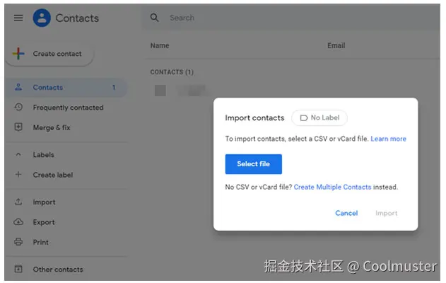 步骤3:访问contacts.google.com,点击左侧菜单中的 “导入” > 选择刚刚保存的vCard文件。之后,您可以在Android上使用Google帐户登录,并启用联系人同步功能来查看联系人。