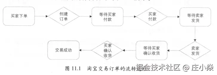 如前面章节所提到的,淘宝交易流程一般经过如下四个业务过程:下单→支付一发货一→确认收货