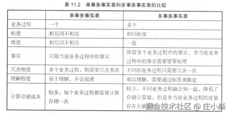 通过前面章节的介绍,我们对数据仓库三种事实表有了详细的了解。一些业务过程可能只需要一种事实表,而另外一些业务过程可能需要两种或三种事实表。三种事实表相互补充,给出业务的完整描述。表11.7对三种事实表进行了比较。