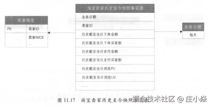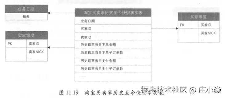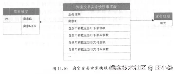 - 第四步:确定事实。对于累积快照事实表,需要将各业务过程对应的事实均放入事实表中。比如淘宝交易累积快照事实表,包含了各业务过程对应的事实,如下单对应的下单金额,支付对应的折扣、邮费和支付金额,确认收货对应的金额等。累积快照事实表解决的最重要的问题是统计不同业务过程之间的时间间隔,建议将每个过程的时间间隔作为事实放在事实表中。在淘宝交易累积快照事实表建模中,由于每个过程的时间间隔计算逻辑简单,因此并未加入事实表中,如图11.25所示。