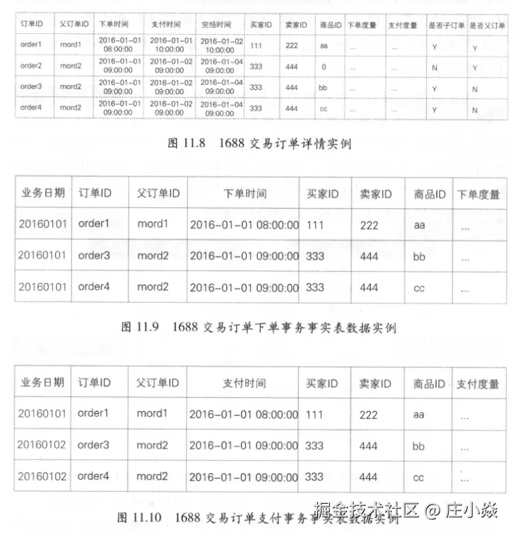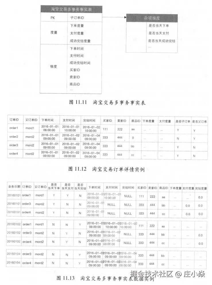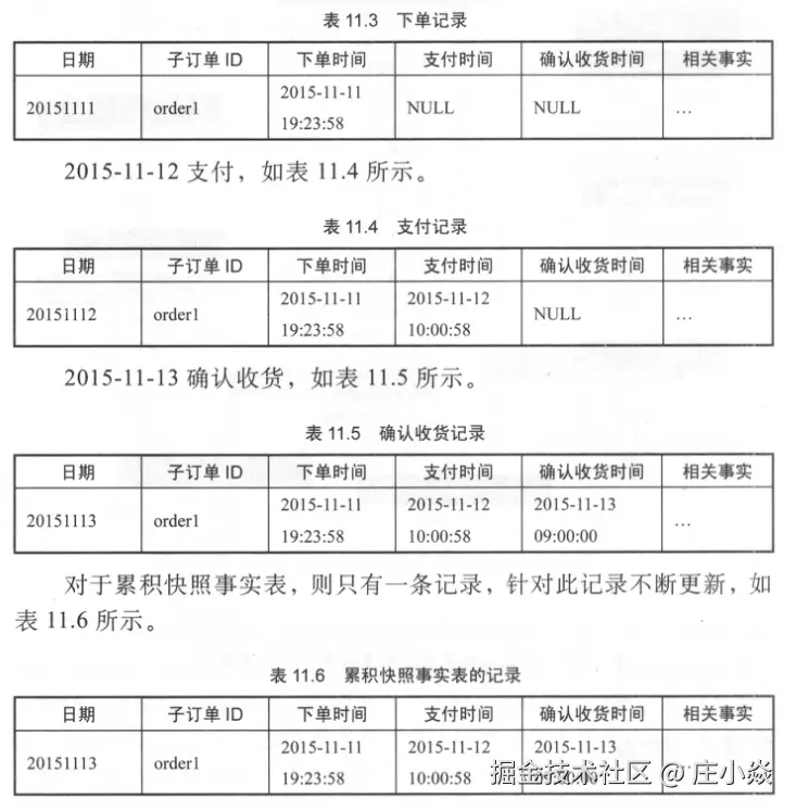 事务事实表记录事务发生时的状态,对于实体的某一实例不再更新,而累积快照事实表则对实体的某一实例定期更新。以淘宝交易为例,表11.3、表11.4和表11.5通过实例展示了事务事实表的情况,假设采用多事务事实表:对于order1订单,2015-11-12支付后,产生新的支付记录,2015-11-11的数据不会更新。截至2015-11-13,买家确认收货后,共产生3条记录。