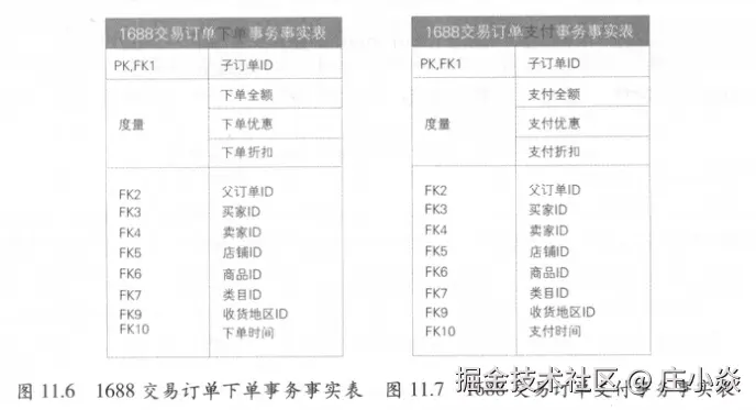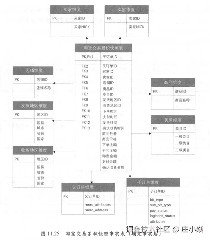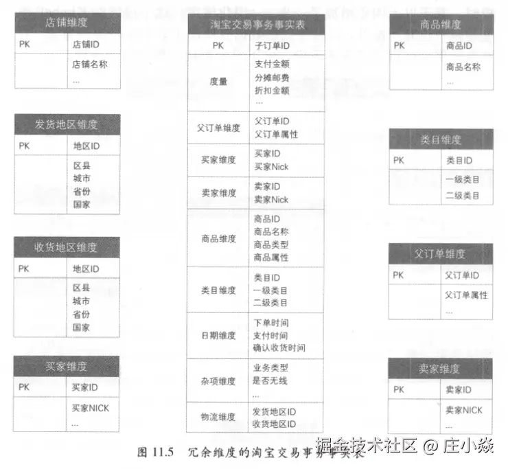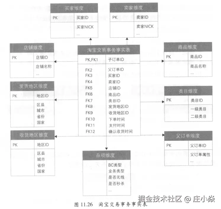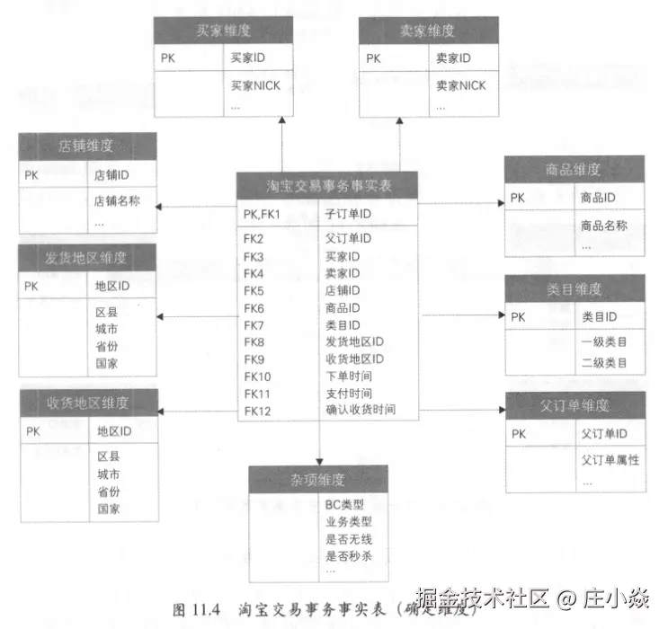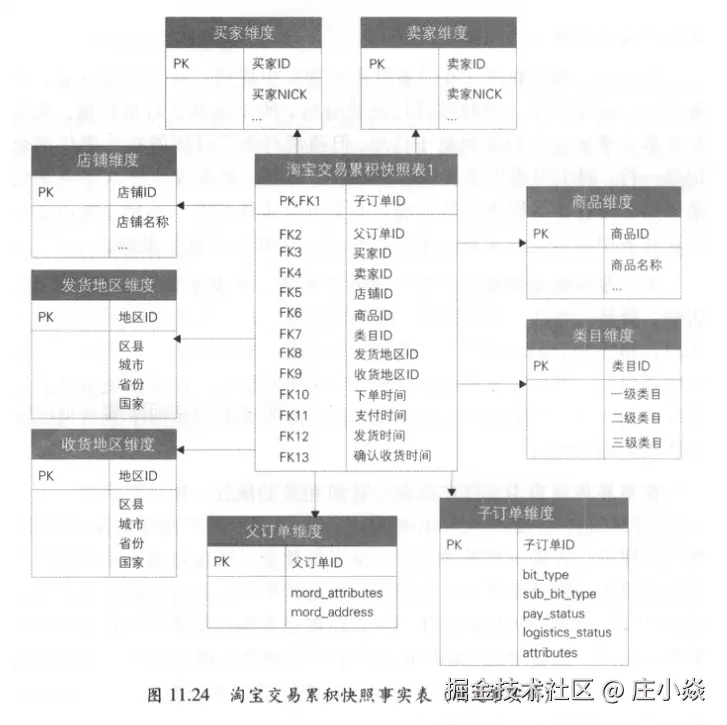 - 第三步:确定维度。与事务事实表相同,维度主要有买家、卖家店铺、商品、类目、发货地区、收货地区等。四个业务过程对应的时间字段,格式为日期+时间,分别为下单时间、支付时间、发货时间、确认收货时间,对应于日期维表,图11.24中未标识。在实际使用时会使用视图或SQL别名的方式表示四个日期角色维度,类似于发货地区维度和收货地区维度。在交易订单表中,存在很多与订单相关的属性,如订单类型、子类型、支付状态、物流状态、attributes、options等。对于类似的属性字段,无法归属到已有的商品等维度中,所以新建杂项维度存放。在数据仓库建模理论中,杂项维度无自然键,一般是枚举值的组合,对于每个组合生成一个代理键。但在实际建模中,存在很多非枚举值,且对于每个订单都不相同,如订单的attributes和options属性。所以实际中杂项维度设计时,也可以直接使用自然键标识具体的维度值,如图11.24中所示的子订单维度和父订单维度。