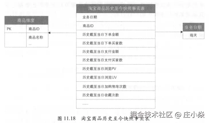 - 第二种方式,和前端业务系统确定口径或使用前端归档策略。累积快照事实表针对业务实体一般是具有较短生命周期的,和前端业务系统确定口径,确定从业务实体的产生到消亡的最大间隔。另外,针对大量的事实数据,前端系统会定期对历史数据进行归档,避免业务库性能的下降,对于这种情况,可以使用前端系统的归档时间作为业务实体的结束日期。