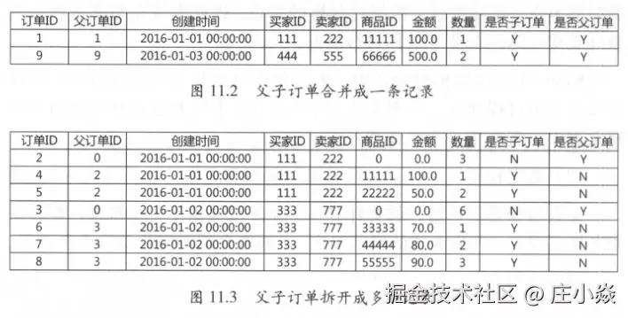 淘宝出售商品主要分两类卖家:一类是个人性质的闲置卖家,主要出售闲置的或者二手商品;一类是拥有店铺的卖家,以出售新商品为主。接下来主要以店铺类交易订单为例进行介绍。在淘宝下单交易时,有两种方式:一种是选定商品后直接购买,这样会产生一个交易订单;一种是将多种商品加入到购物车中,然后一起结算,此时对于每一种商品都会产生一个订单,同时对于同一个店铺会额外产生一个订单,即父订单;由于是在同一个店铺购买的,所以父订单会承载订单物流、店铺优惠等信息。而对于每一种商品产生的订单就称为子订单,子订单记录了父订单的订单号,并且有子订单标志。如果在同一个店铺只购买了一种商品,则会将父子订单进行合并,只保留一条订单记录。如图11.2和图11.3所示示例。