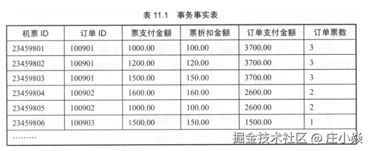 该事实表中。而订单支付金额和订单票数作为上一层粒度的订单级事实,与该票级事实表的粒度不一致,且不能进行汇总。比如订单D为100901的订单支付金额为3700元,订单票数为3张,如果这两个度量在该表进行汇总计算总订单金额和总票数,则会造成重复计算的问题,所以不能作为该表的度量选入。