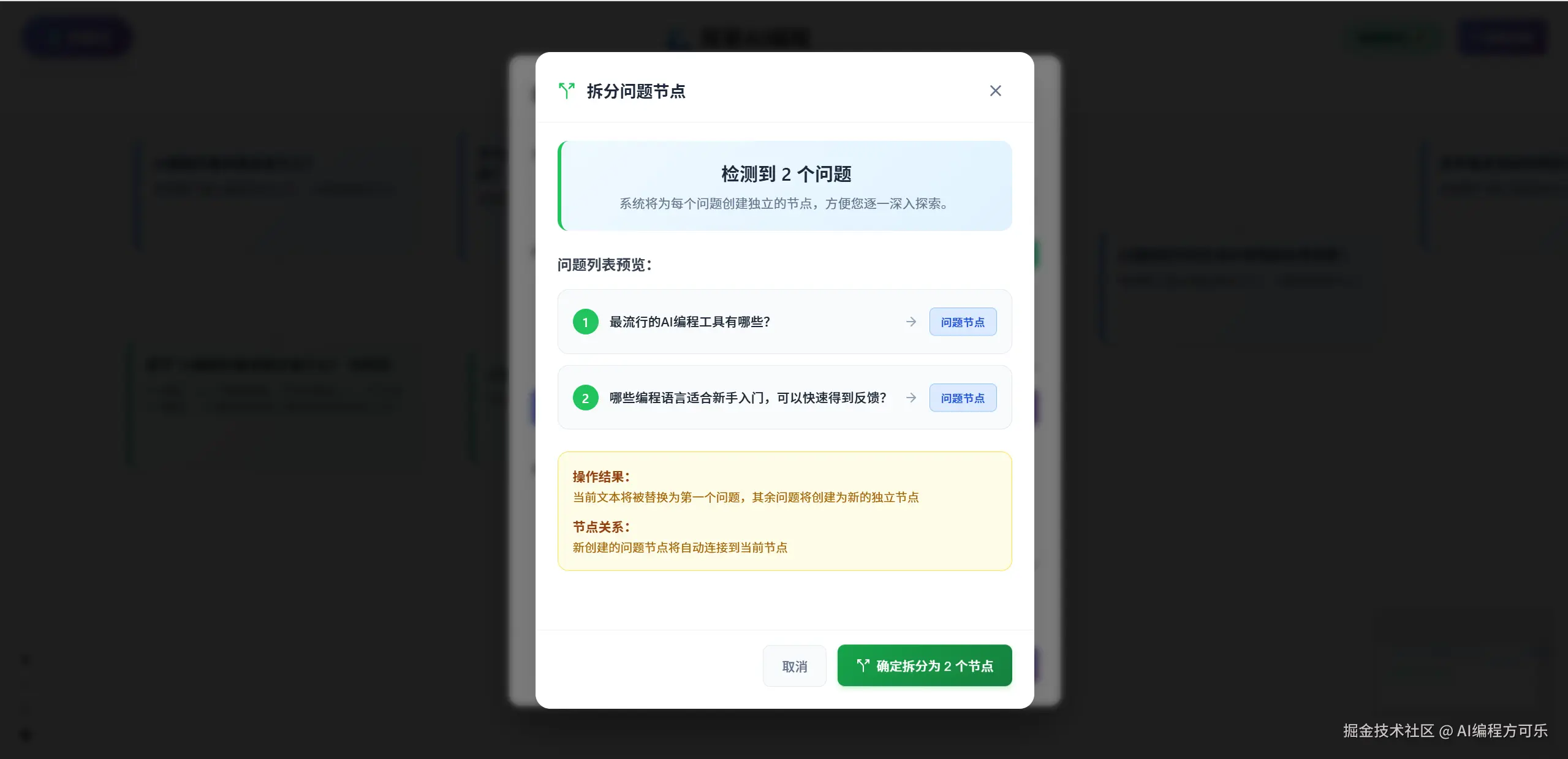 可以看到,我们确认拆分以后,就会变成多个问题节点。那我们就根据每个小问题,来继续探索。