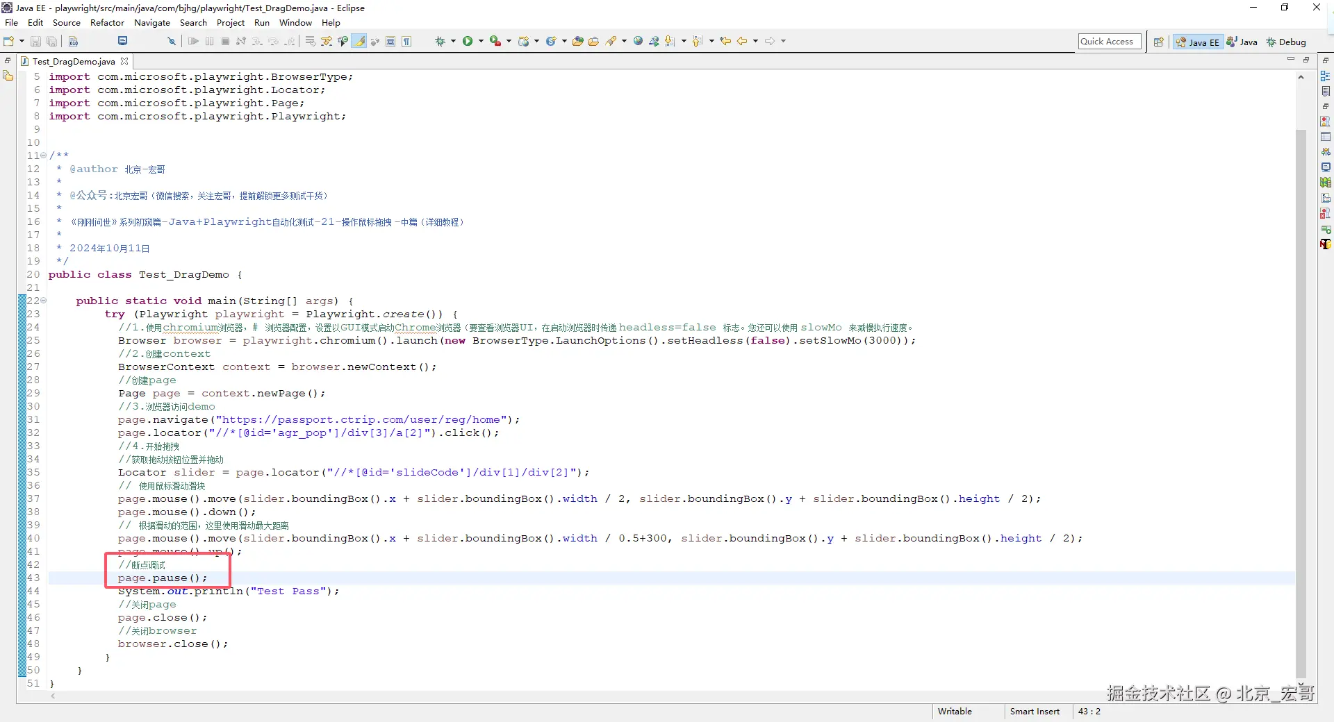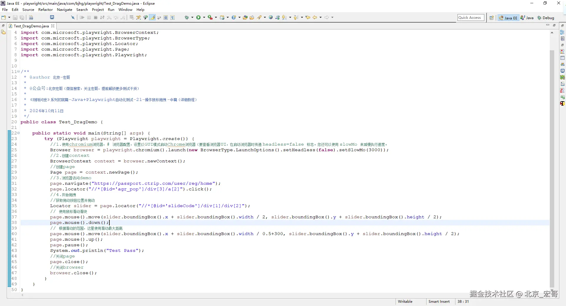 selenium中提供了ActionChains类来处理鼠标事件。这个类中有2个方法和滑块移动过程相关。click_and_hold():模拟按住鼠标左键在源元素上,点击并且不释放;release():松开鼠标按键。字面意思就可以理解这2个函数的作用。今天跟随宏哥看一下,playwright是如何处理这种测试场景的。