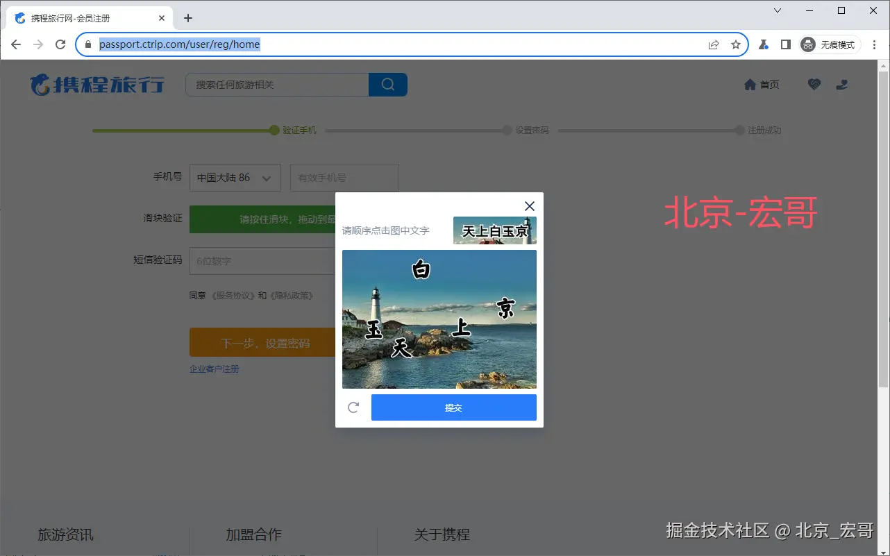 这里宏哥用java+selenium中的携程旅行,手机号查单页面的一个滑动,进行项目实战,结果发现挂了,携程取消了,可以能是用的人太多了吧,然后宏哥继续逛,果然皇天不负有心人啊,在其上边又找的一个滑动验证的地址(注册颜面),不过需要先点击同意协议才可以使用的哦,写代码的时候要注意了,地址:passport.ctrip.com/user/reg/ho… ,如下图所示: