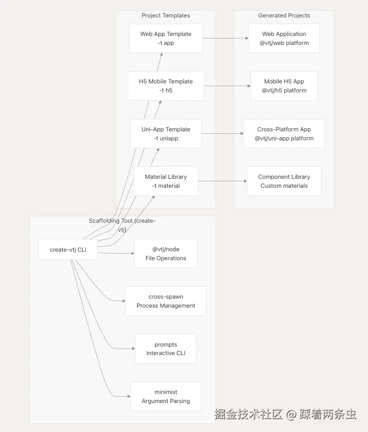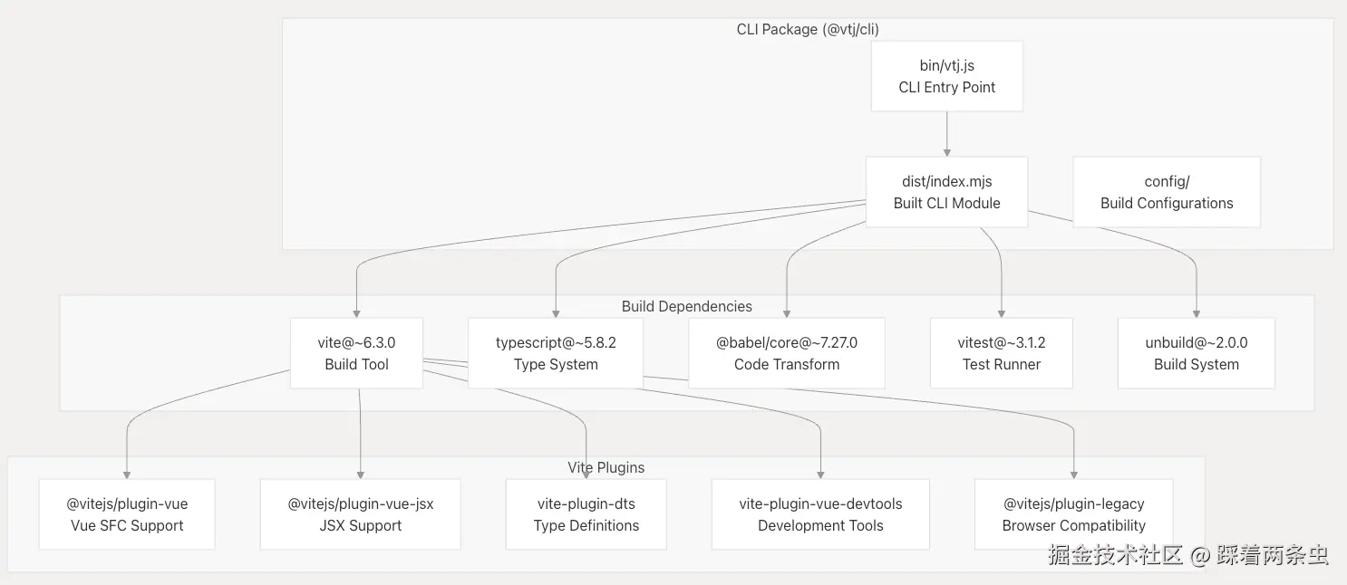 CLI 包通过 vtj 二进制命令公开其功能,主要实现使用 unbuild 构建以实现最佳 Node.js 兼容性。