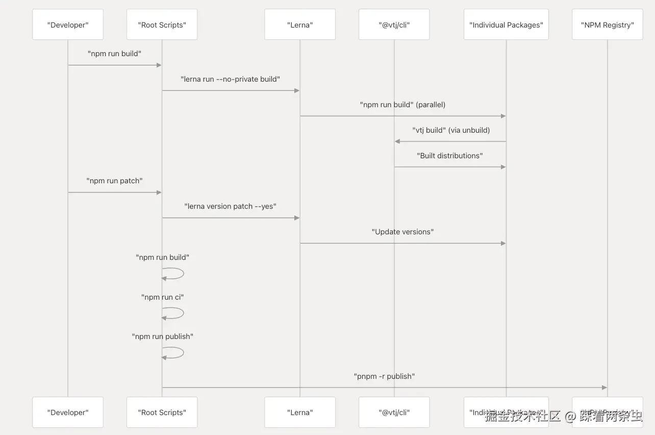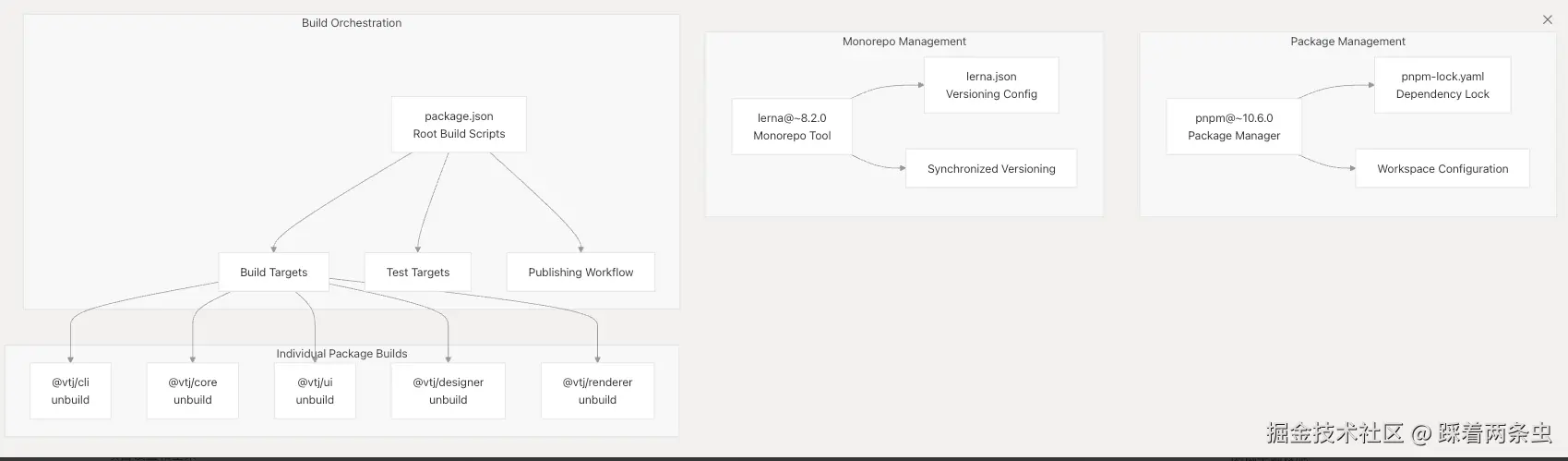 VTJ 使用由 Lerna 和 PNPM 管理的复杂 monorepo 结构,支持跨所有软件包的协调开发和同步发布。