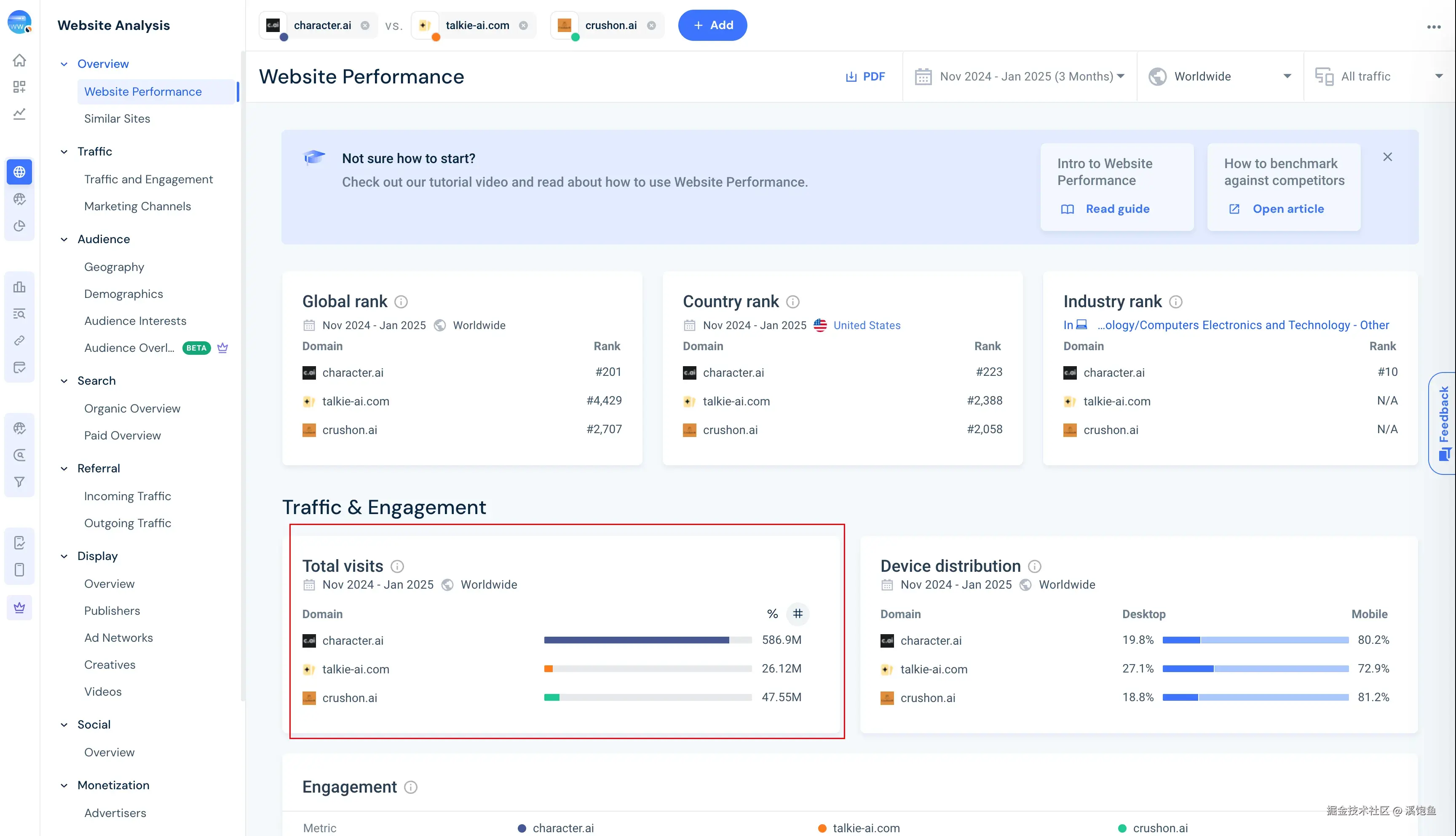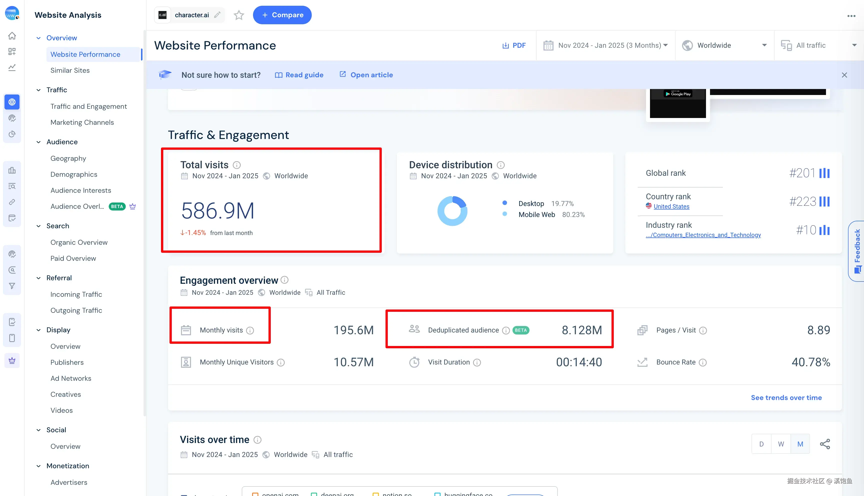 我们以character.ai为例,它是Ai RolePlay(AI角色扮演)的行业龙头,点到website performance(网站表现),如图所示: