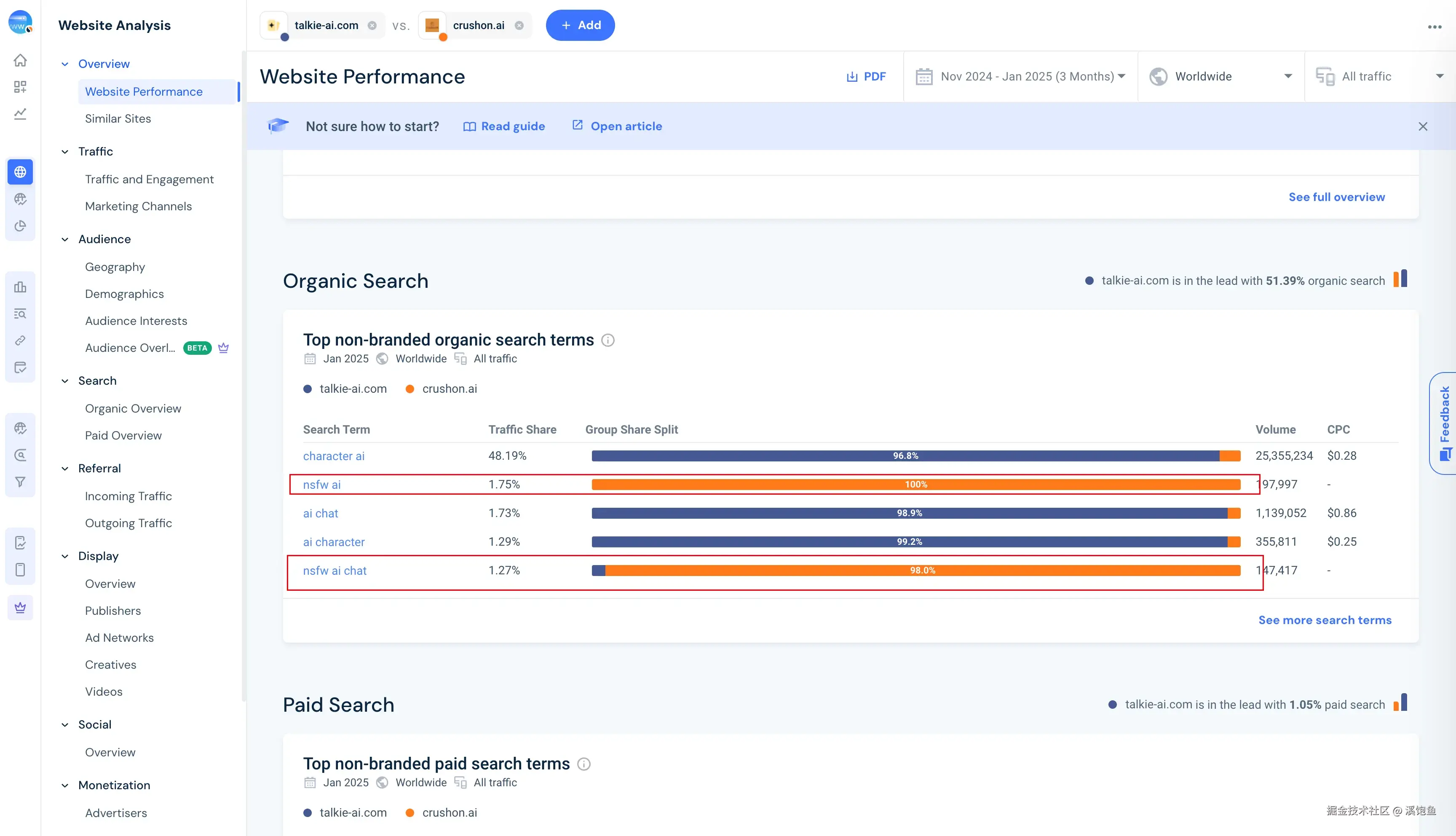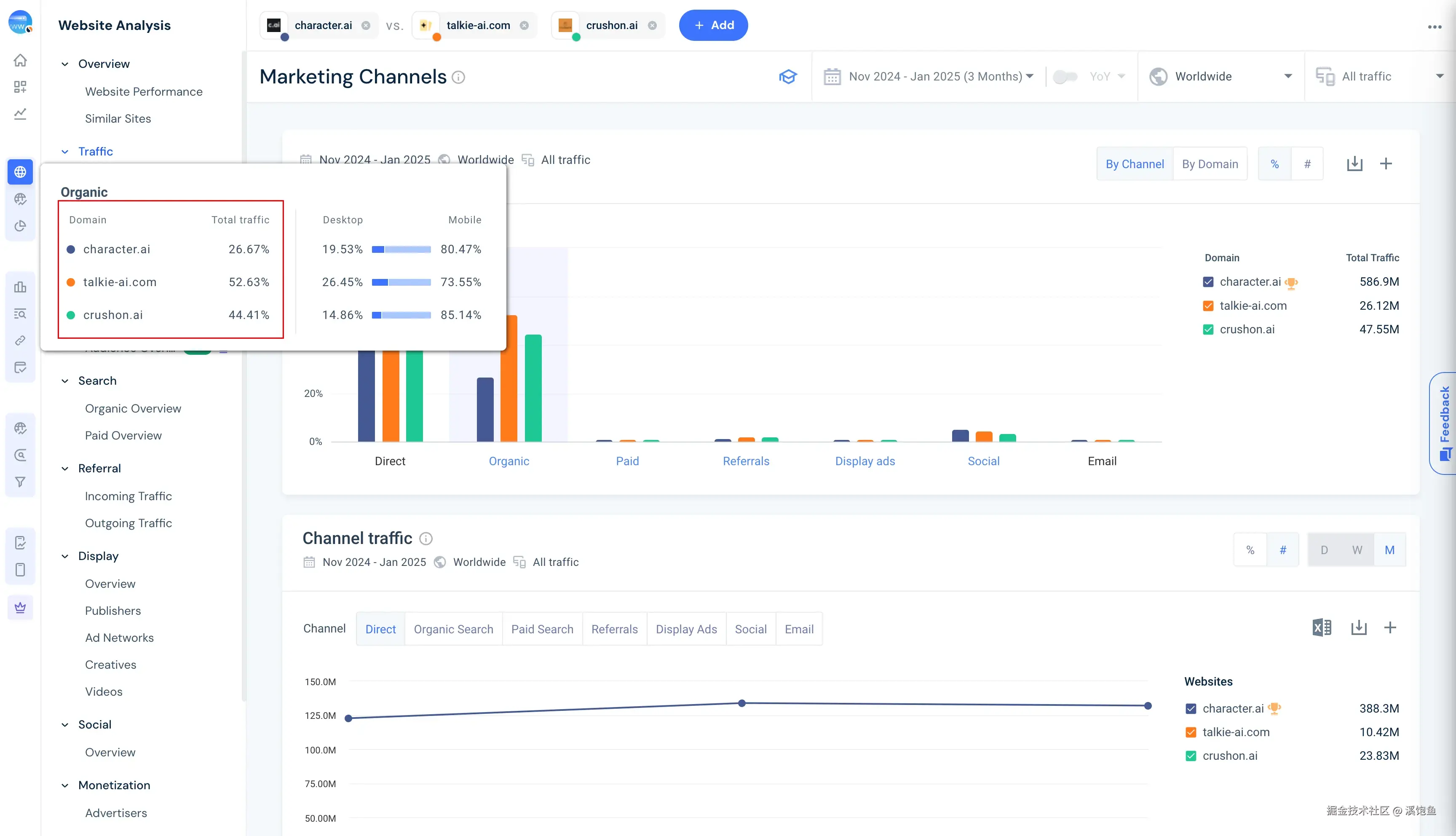 在这里我们可以看到Direct(直接打开,输地址)和Organic(自然搜索流量),我们主要观察自然流量占比,可以看到talkie和crushOn的搜索流量表现都非常不错,而cai是因为本身的知名度和品牌已经做上去了。