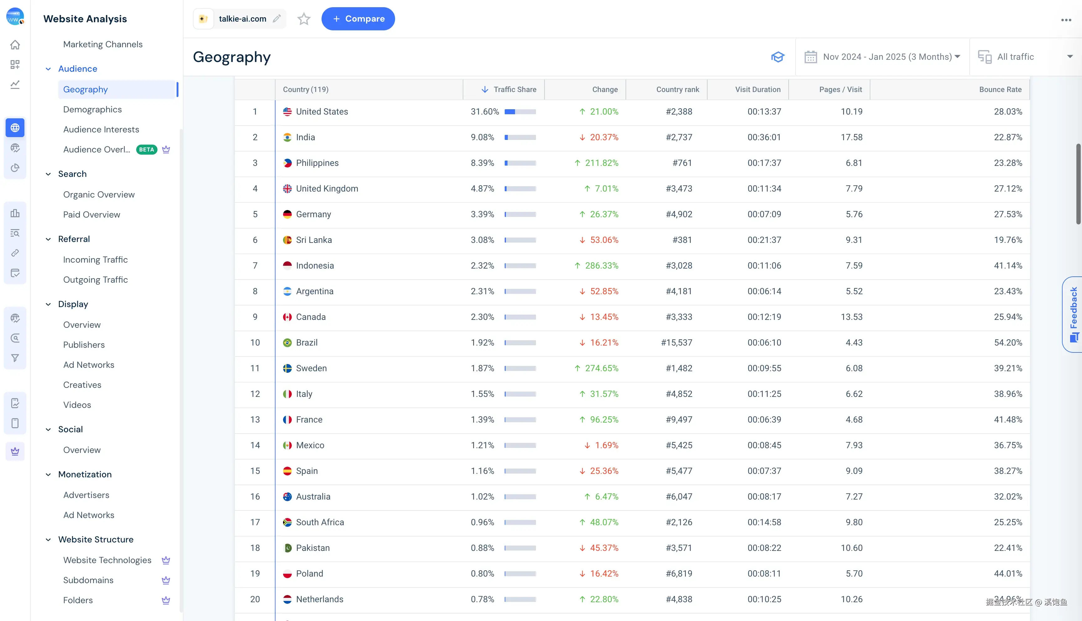 在进行SEO优化时,了解网站的流量来源和用户特征是至关重要的。这些信息可以帮助我们制定更精准的SEO策略和内容计划。接下来,我们将从地理分布、人口统计和用户兴趣三个方面对talkie的用户群体进行深入分析。