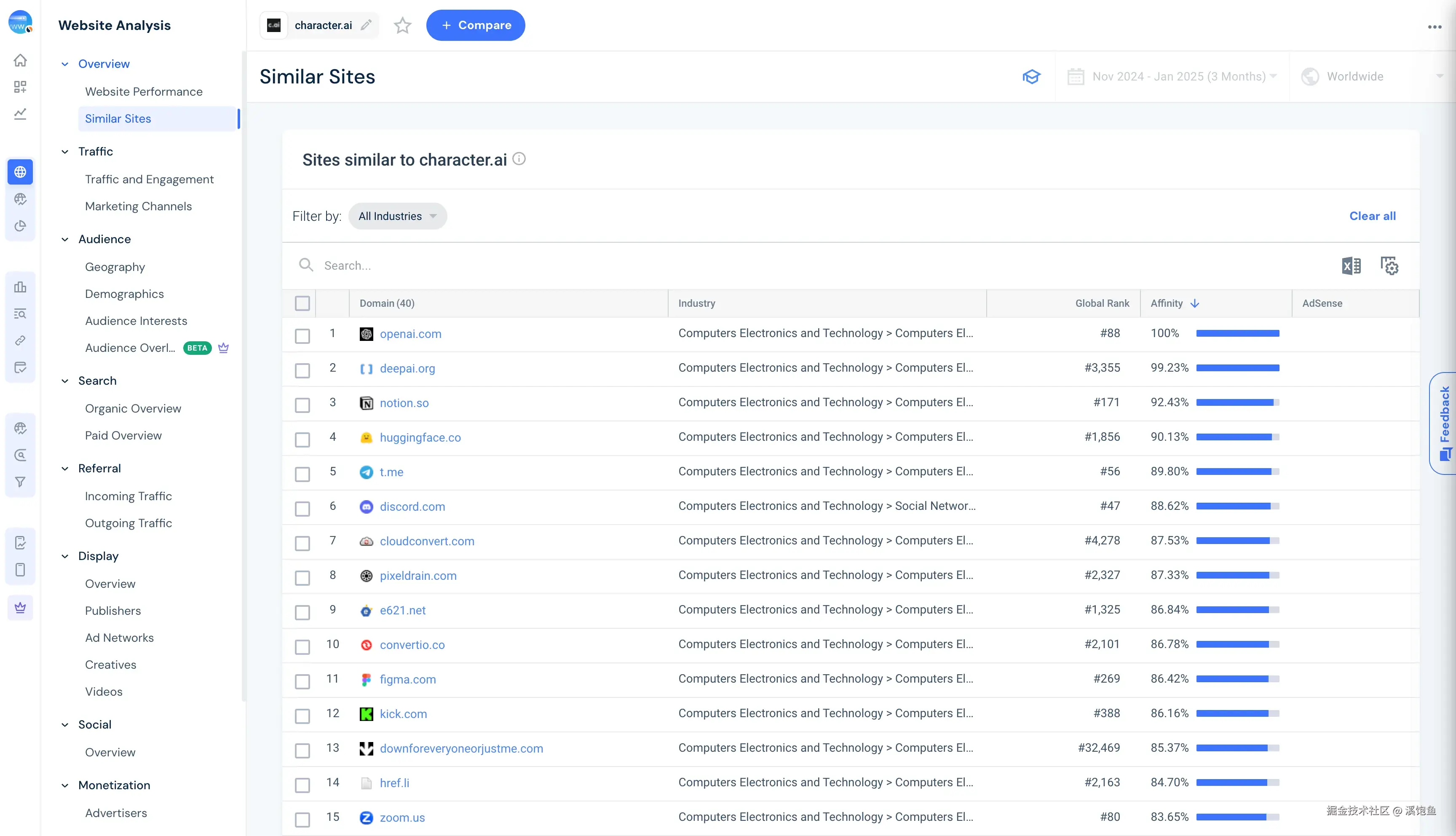 但此时我们需要有数据进行对比(单个数据无法形成坐标系),我们可以拿一些产品进行对比,如果本身对行业不太熟悉可以点击上图的Similar Sites(相似网页)。