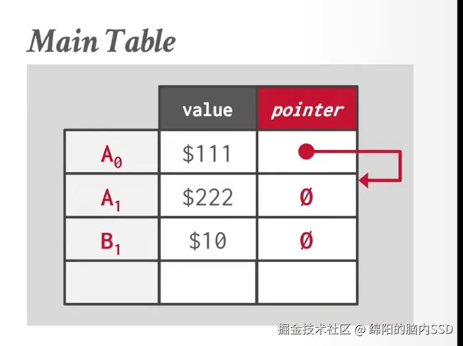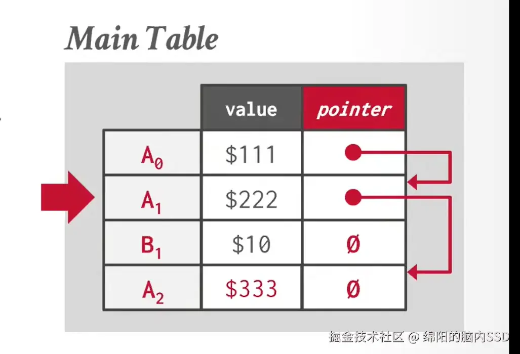 具体细节就是当来了一个新的元组, 然后就把他插入这张表中, 因为对于数据库中的每一张表, 都会被分配一个表空间存储这些元组。然后每次更新元组, 比如更新A, 那么就要跟新A的版本链, 让A的版本链中最新的节点指向新更新的节点。 这里的问题就是每次链接版本链, 都要从表中查找该数据的头节点。