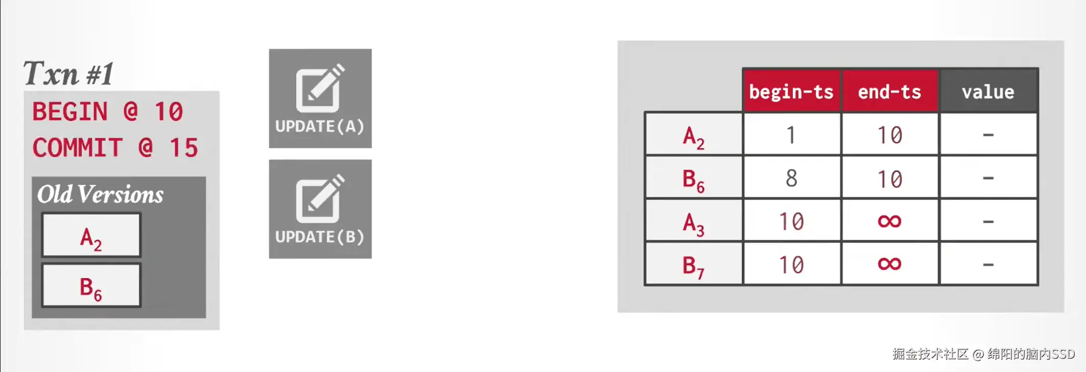 - 如果自身携带的时间戳处于begin-ts ~ end-ts之间, 那么观察一下active table(这也是一张表, 包含了当前正在活跃的事务) 中这个版本的begin-ts所在事务是否在活跃, 即没有提交。 如果提交了, 可以看到, 没提交, 看不到。