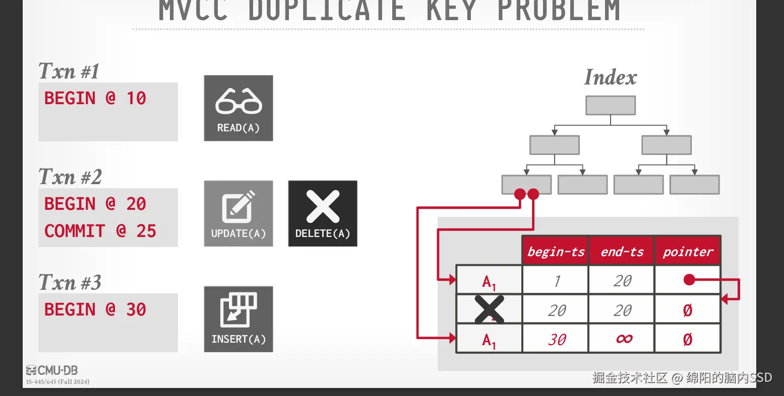 就是假如一开始T1读取到了A, T2读取A, 然后删除了A。 并且T1读取的是A1, T2读取的是A2, 删除的也是自己可见的A2。 那么T3插入一个A, 他插入的应该是从时间戳30开始生效。 所以, 这里就要保证两个东西: