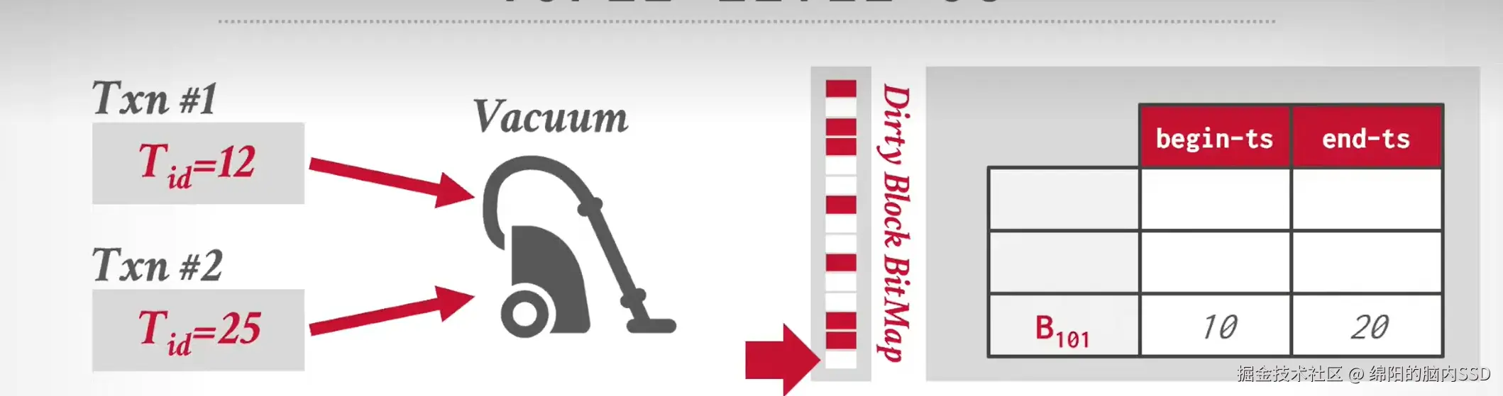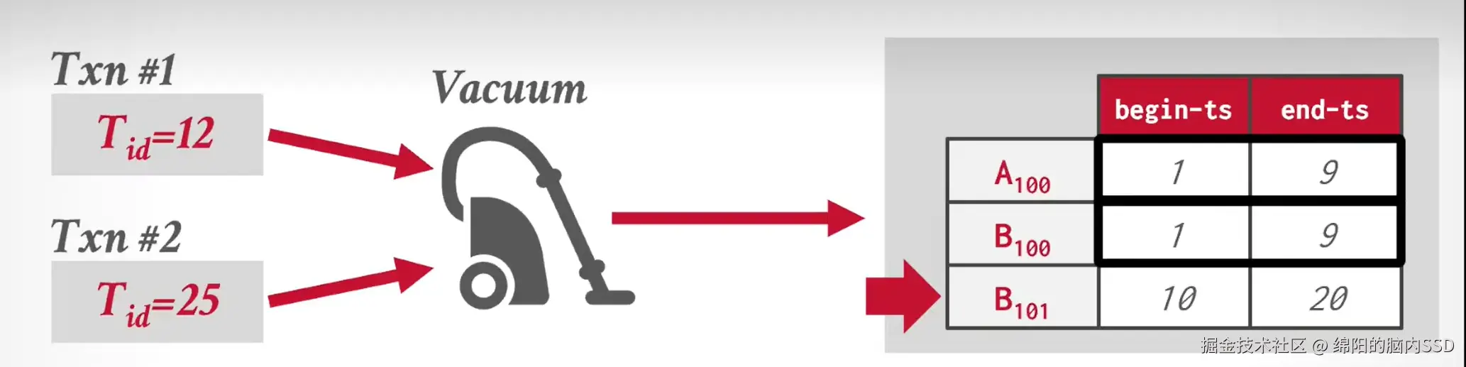 这里同样不太理解, 因为如果vacuum只处理单个事务的最小时间戳那么就不正确, 所以这里vacuum应该处理的是所有事物的最小时间戳。但是这样要一边修改一遍记录, 然后交给后台进程处理, 相当于元组GC的后台worker了。 (TODO)