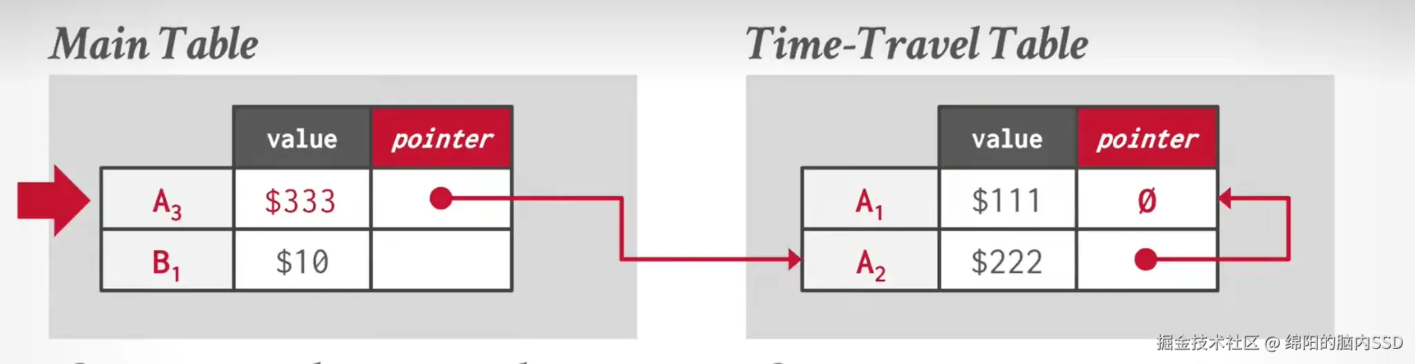 时间旅行存储并不比追加存储好, 只是它出现在了并没有那么多Mvcc设计的年代, 并且如果采用从旧到新的方式, 进行垃圾回收的时候, 要进行数据压缩, 版本新的Time-TravelTable称为新的Main Table。