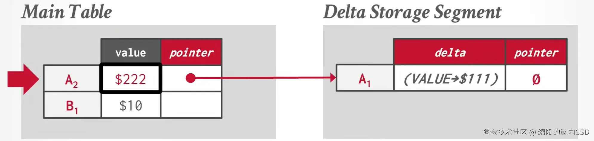 仅追加存储就是每当更新新的版本, 就将旧的版本作为新元组追加到版本链中。