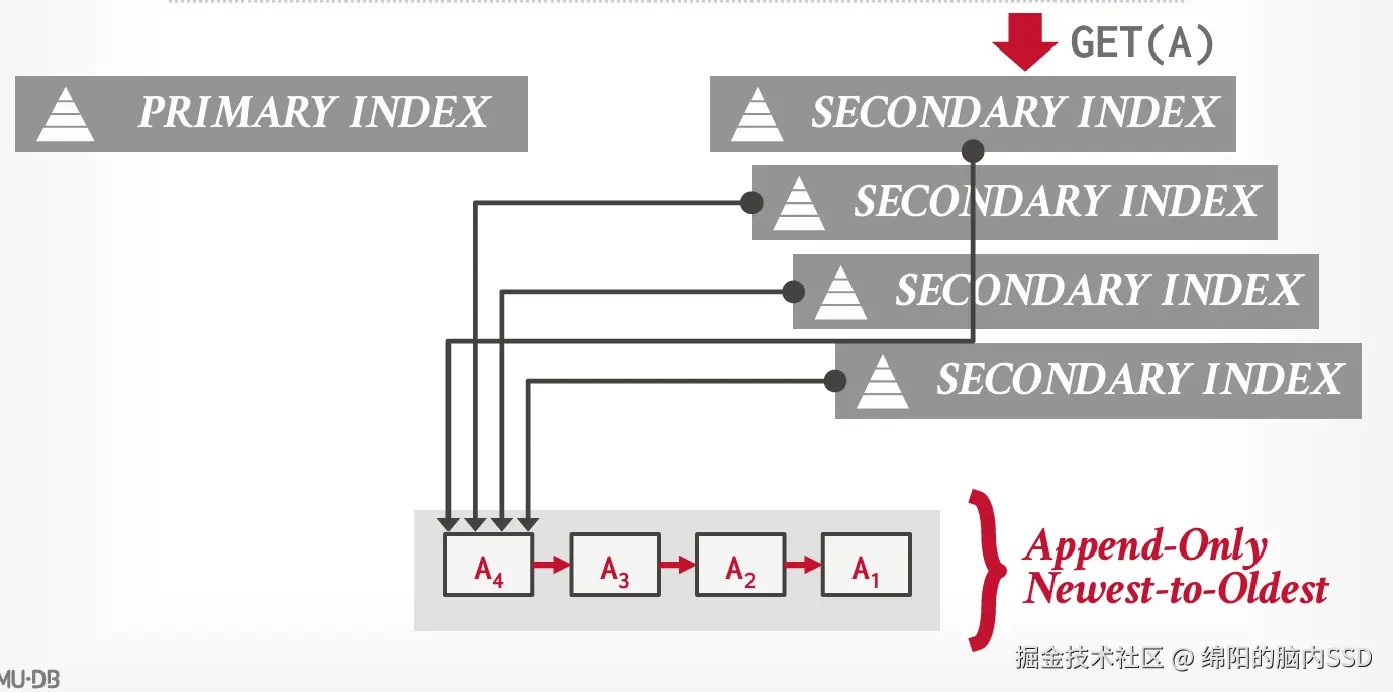 在数据库中可能有大量的二级索引, 这些二级索引都指向了版本链的头部。 此时就可以根据二级索引来找到具体的物理地址。但是如果更新元组, 即便不更新这个元素中二级索引所依赖的属性, 那么这个依旧要更新所有二级索引指向新链头。