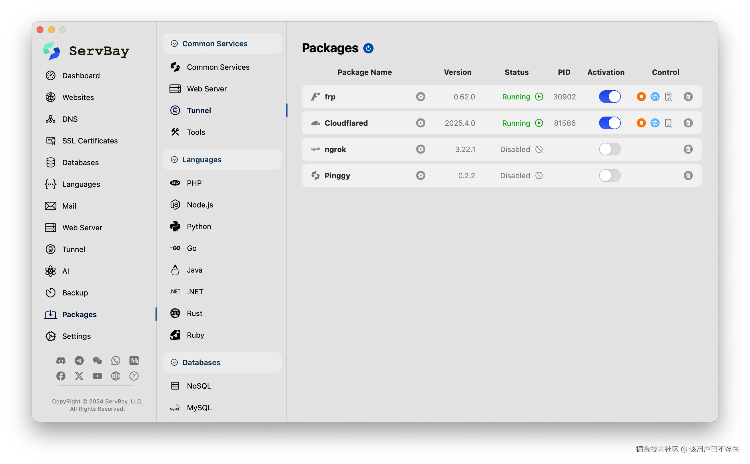 https://*.serv本地域名和SSL证书。更进一步,ServBay还集成了内网穿透功能,支持frp、cloudflare、pinggy、Ngrok。这意味着你无需任何复杂配置,就能将本地站点生成一个临时公网链接,方便地分享给客户进行演示,或在手机上进行真机调试。