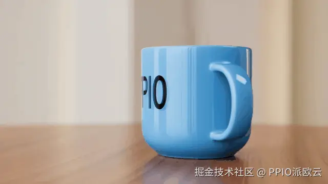 提示词:一个天蓝的的马克杯放在桌子上,杯子上写着 PPIO 四个字母,镜头从左边摇到右边。
