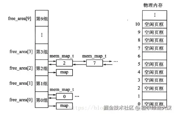 结合图比如,要分配4(2^2)页(16k)的内存空间,算法会先从free_area2中查看free链表是否为空,如果有空闲块,则从中分配,如果没有空闲块,就从它的上一级free_area3(每块32K)中分配出16K,并将多余的内存(16K)加入到free_area2中去。如果free_area3也没有空闲,则从更上一级申请空间,依次递推,直到free_area max_order,如果顶级都没有空间,那么就报告分配失败。