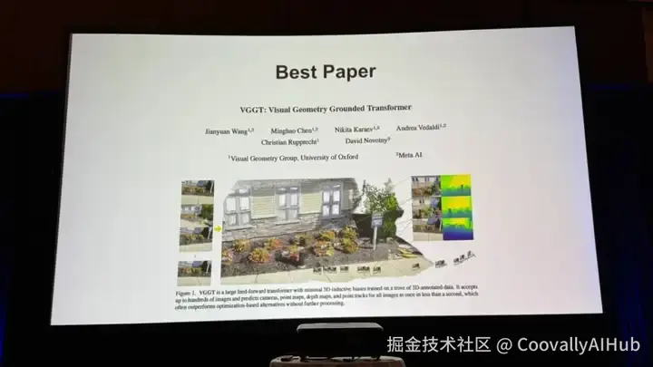本届CVPR最大亮点当属3D视觉技术的突破性进展。获得最佳论文的VGGT(视觉几何基础Transformer)由牛津大学与Meta的华人博士生王建元领衔开发。