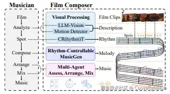 上海电影学院团队则开创性地将AIGC技术应用于电影配乐,其 FilmComposer框架 能根据电影片段自动生成专业级配乐,实现音画在语义、节奏和进展上的精确对齐。