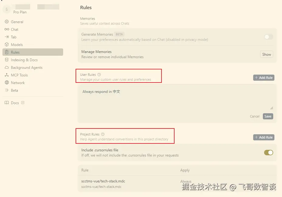 .mdc,而不是原来的.cursorrules,但 Cursor 依然兼容原来的 cursorrules,记得勾选 “Includes .cursorrules file” 即可。