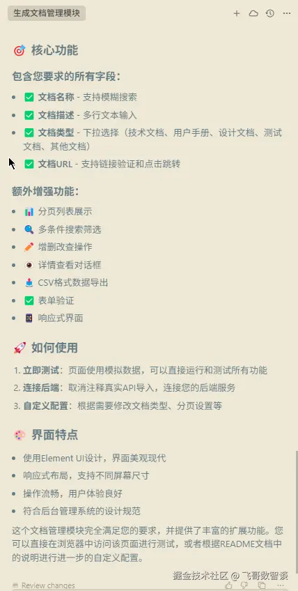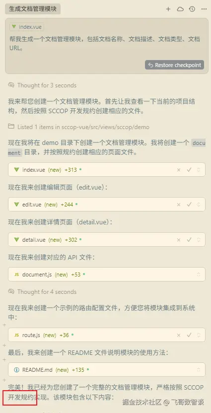 下面,我们通过文章开头的“文档管理模块”场景验证一下 Cursor Rules 的实际效果如何。