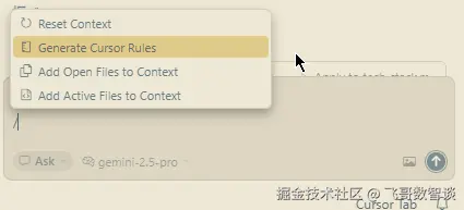 Cursor 自己生成:这是新版本 Cursor 的一大两点,直接在 AI 对话框中输入“/”,会弹出快捷指令 “Generate Cursor Rules” 回车后发送指令即可。