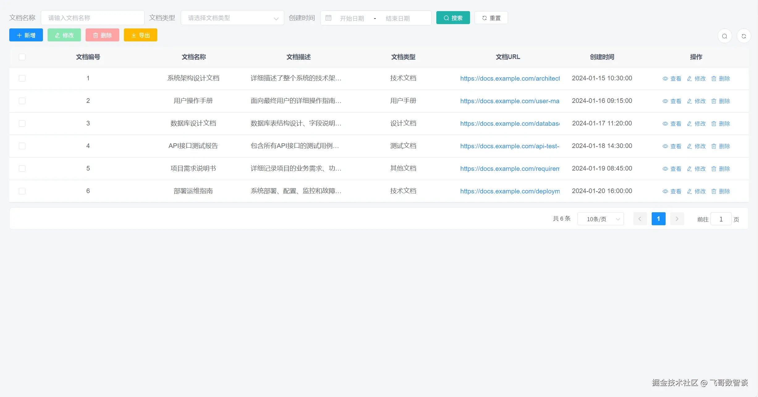帮我生成一个文档管理模块,包括文档名称、文档描述、文档类型、文档URL。