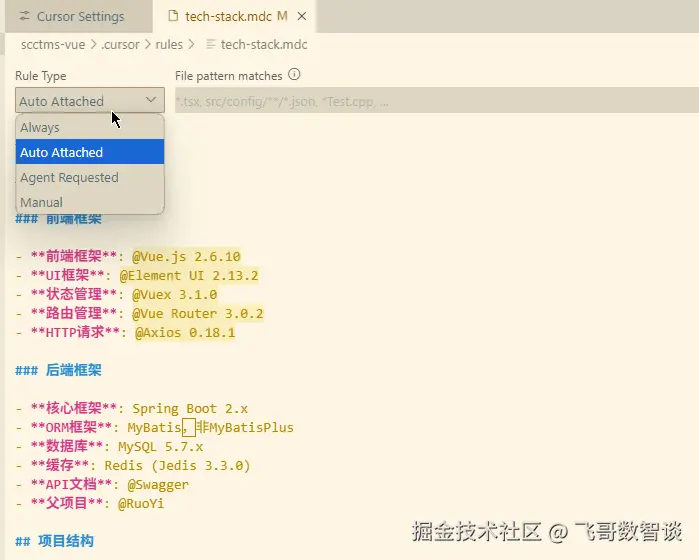 如上图,我设置了一个项目规则文件tach-stack.mdc,打开它,我们会发现除了文本内容外,最顶部还有一个类型设置。