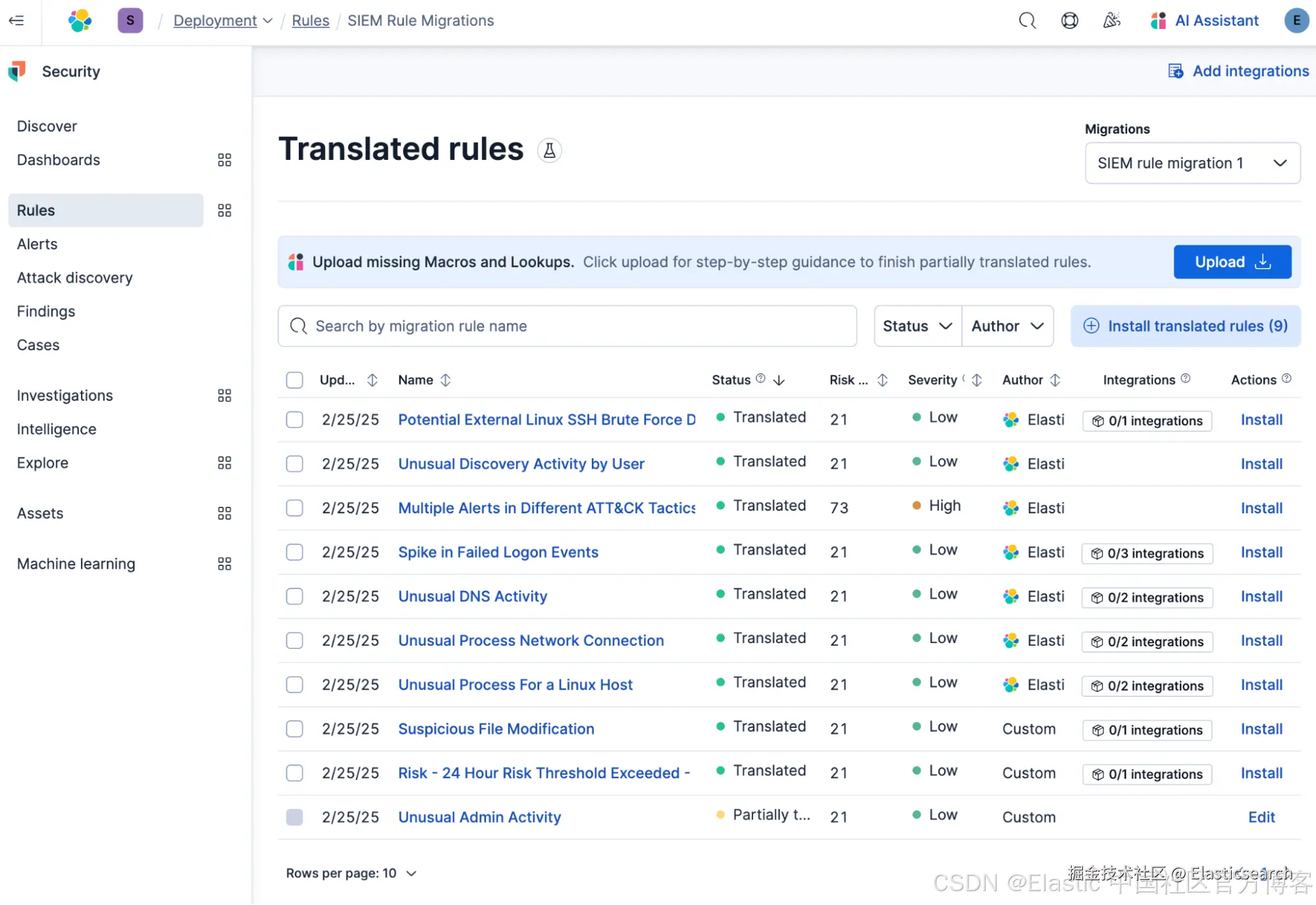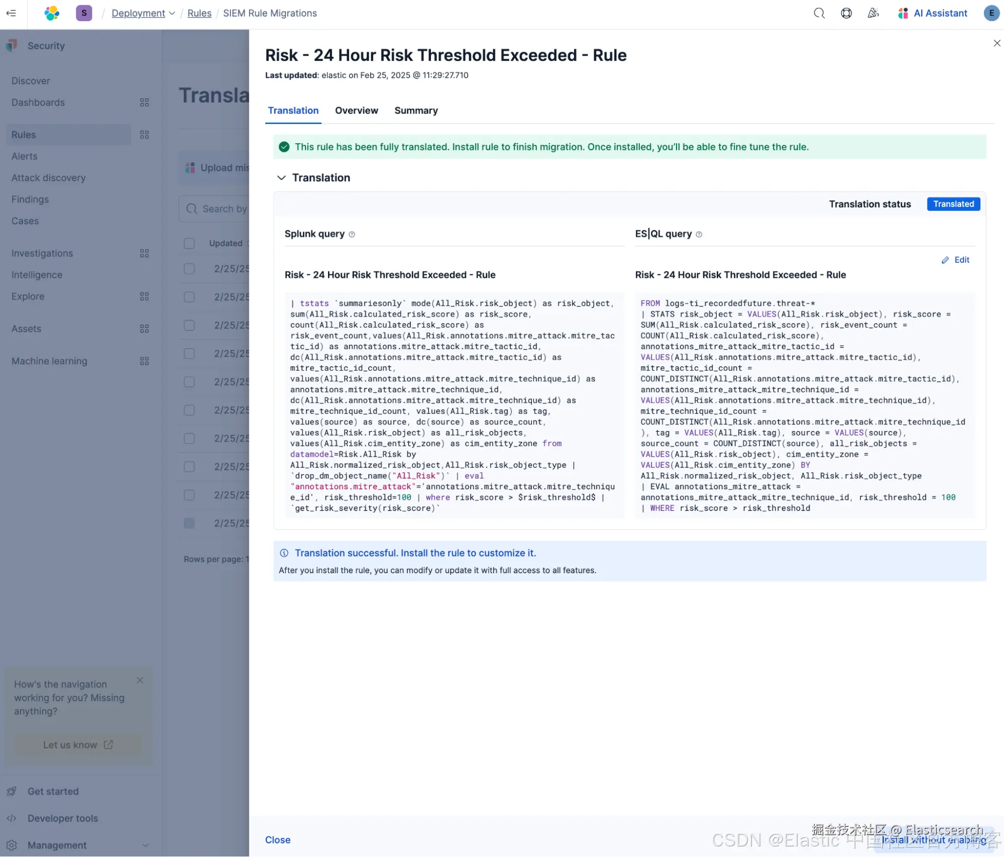 Automatic Migration 可以可靠地将复杂的 Splunk 检测规则迁移到 Elastic Security。该功能使用基于 ELSER 自然语言处理(NLP)模型的语义搜索,将现有规则映射到 Elastic 内置规则,即使没有完全匹配的文本,也能匹配相应规则。未映射的规则(包括关联的查找表和宏)会通过基于自定义知识的生成式 AI 转换成新的 Elastic 查询。迁移完成后,Automatic Migration 会验证转换的规则,并提供直观界面便于快速安装。