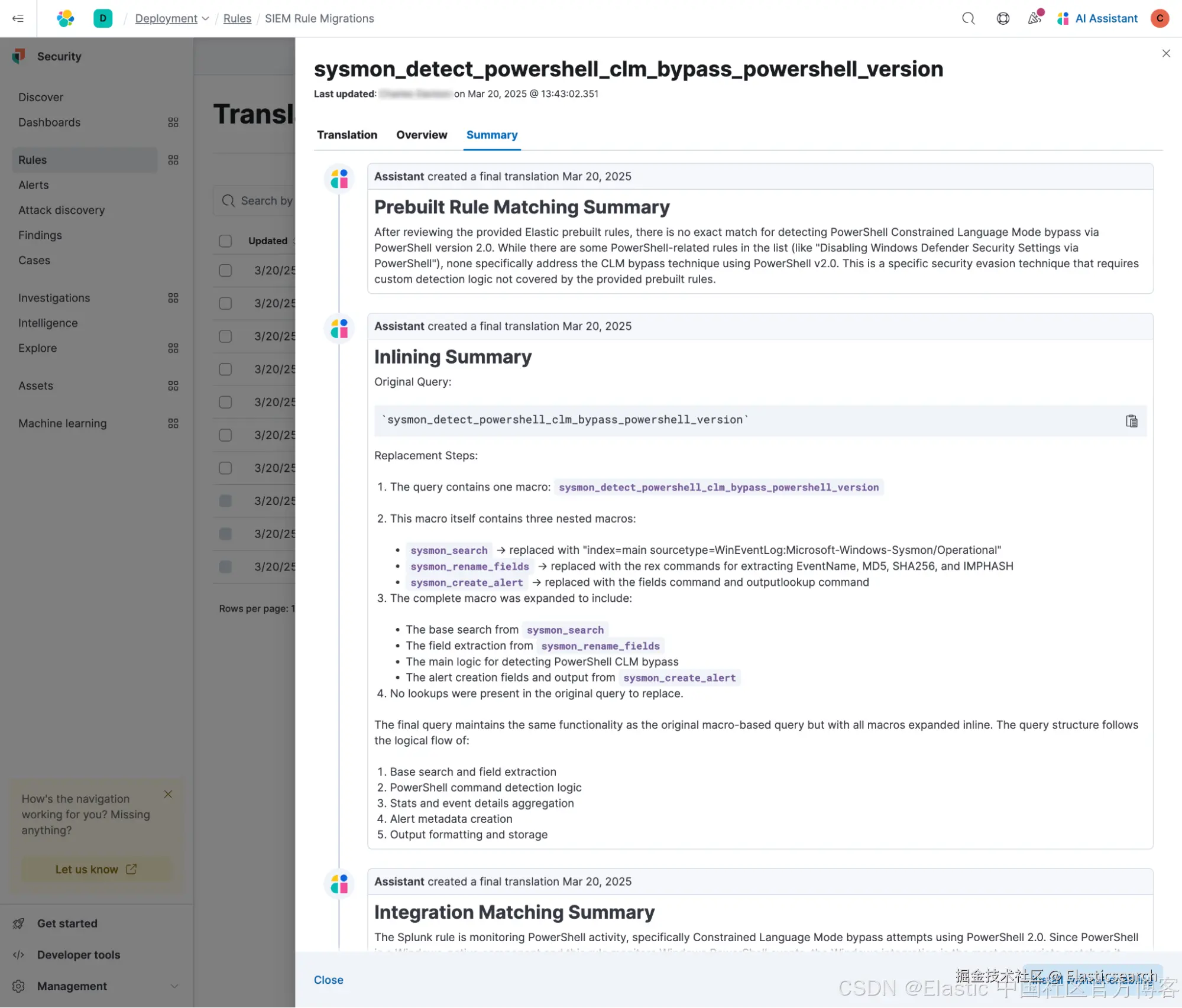理解并信任你的检测结果至关重要,因此 Automatic Migration 会详细说明每条规则是如何映射或翻译的。Summary(摘要)标签页概述了关键决策的理由 —— 比如字段分配和特定 ES|QL 命令的使用 —— 并突出显示任何缺失的宏或查找表。这种透明度帮助你验证翻译规则的行为,确保符合你的检测目标。
