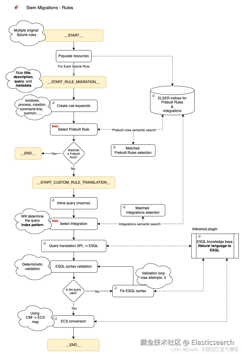 当没有对应的预构建规则时,Automatic Migration 会创建自定义规则并验证其功能。它首先使用检索增强生成(retrieval augmented generation - RAG)识别与查询相关的预构建数据集成。然后将查询从 Search Processing Language(SPL)翻译为 ES|QL,利用基于自定义知识的 AI 进行转换。接着系统确定性地验证语法,如有必要会循环修改并重新测试逻辑。该流程确保每条完整翻译的规则符合 Elastic 的模式和结构,实现规则的可靠执行和性能。