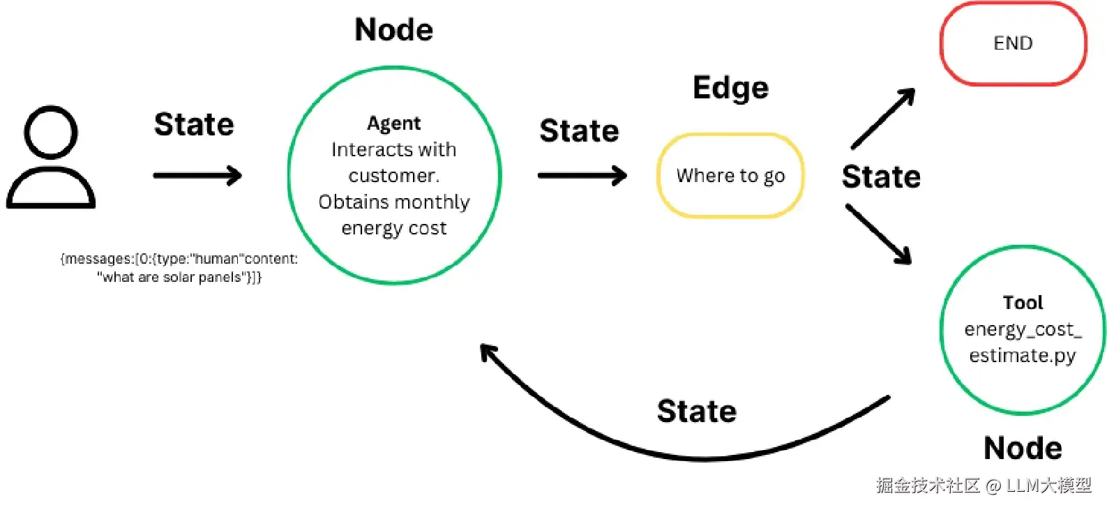 - LangGraph 将输入消息添加到内部状态,然后将状态传递给入口点节点