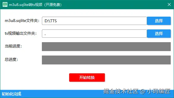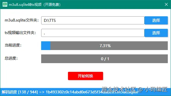 该项目允许用户选择包含m3u8.sqlite文件的源文件夹,并指定解码后.ts文件的目标输出文件夹。通过点击"开始转换"按钮,用户可以轻松地将所选文件转换为目标格式。另外,该工具还提供了进度显示和解码完成的通知功能。